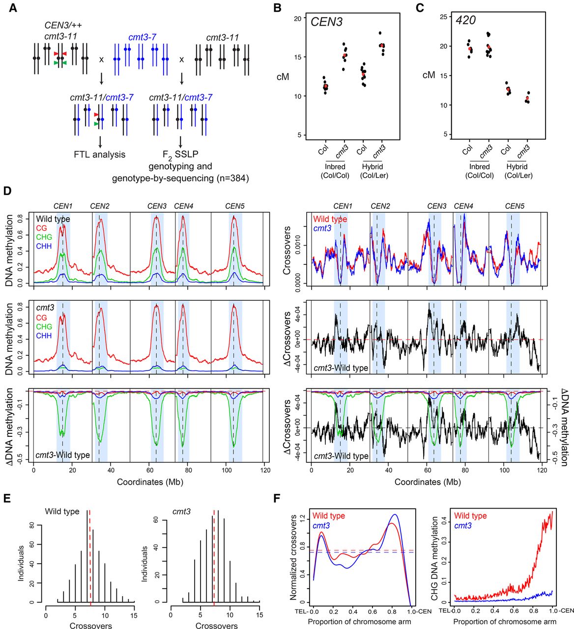 Genome-wide mapping of crossover frequency in cmt3 non-CG mutants. (A) Crossing scheme used to analyze recombination in cmt3 mutants. Col chromosomes are black and Ler chromosomes are blue. The CEN3 FTL T-DNAs are indicated by red and green triangles. (B) CEN3 crossover frequency (cM) in wild type and cmt3, in Col/Col inbreds, or Col/Ler F1 hybrids. Replicate measurements are shown in black and mean values in red. (C) 420 crossover frequency in wild type and cmt3, in Col/Col inbreds, or Col/Ler F1 hybrids, as shown for B. (D) Plots of the A. thaliana chromosomes on a continuous x-axis are shown. Analysis of DNA methylation frequency in CG (red), CHG (green), and CHH (blue) from published data in wild type (Col) or cmt3-11 (Stroud et al. 2013) (left panels). A differential (cmt3 − wild type = ΔDNA methylation) plot is also shown. Vertical dotted lines indicate the position of the centromere assembly gaps and vertical solid lines indicate telomeres. The pericentromeres, defined by higher than average DNA methylation, are indicated by light blue shading. The normalized frequency of crossovers mapped by GBS in wild type (red) and cmt3 (blue) F2 populations is plotted (right panels), in addition to the cmt3 − wild type differential (ΔCrossovers). (E) Histograms of crossovers per F2 individual for wild-type and cmt3 populations. Red dotted lines indicate mean values. (F) Normalized crossover frequency analyzed along chromosome telomere (TEL) to centromere (CEN) axes in wild-type (red) and cmt3 (blue) populations. CHG DNA methylation was analyzed and plotted similarly for wild type (red) or cmt3 (blue) (Stroud et al. 2013).