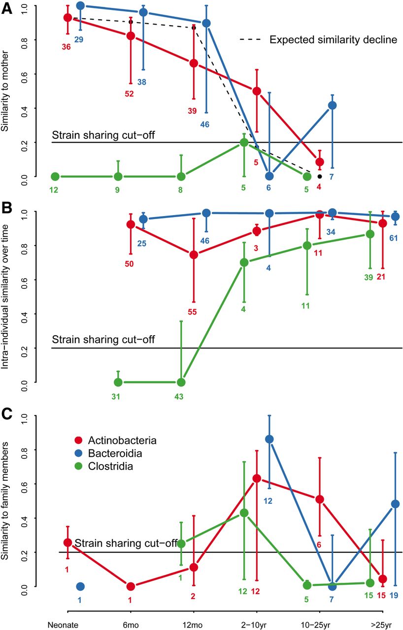 Phylogenetic signal in strain transmission and stability. (A) Strain population (rmSNV profile) similarity of vaginally born infants to mother. (B) Intra-individual rmSNV similarity over time in vaginally born infants and children, and adults regardless of birth mode. (C) Strain population (rmSNV) similarity to other family members. The symbols represent age group medians ± inter-quartile range per bacterial class. The number of individuals included in each group is indicated. Expected similarity decline is based on the intra-individual similarity decline in Figure 2C.