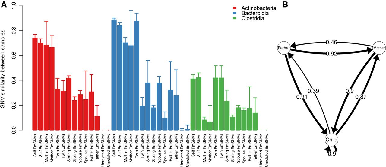 Strain similarity and transmissions within families. (A) The bars indicate mean ± SD. Two sets of rare marker SNVs were defined per pair of individuals: rare marker SNVs, which were allowed to be shared with other family members (marked here as Family marker SNVs, FmSNVs), and exclusive marker SNVs (EmSNVs), which were only shared between the compared pair. (B) The arrows indicate the cases where novel SNVs emerging in the focal individual were observed in previous time points of a given family member. The arrow from child to child indicates transmission between siblings. The numbers on the arrows represent the proportion of identified transmission events between the indicated pair of family members (number of observed transmission events/total number of family member comparisons).