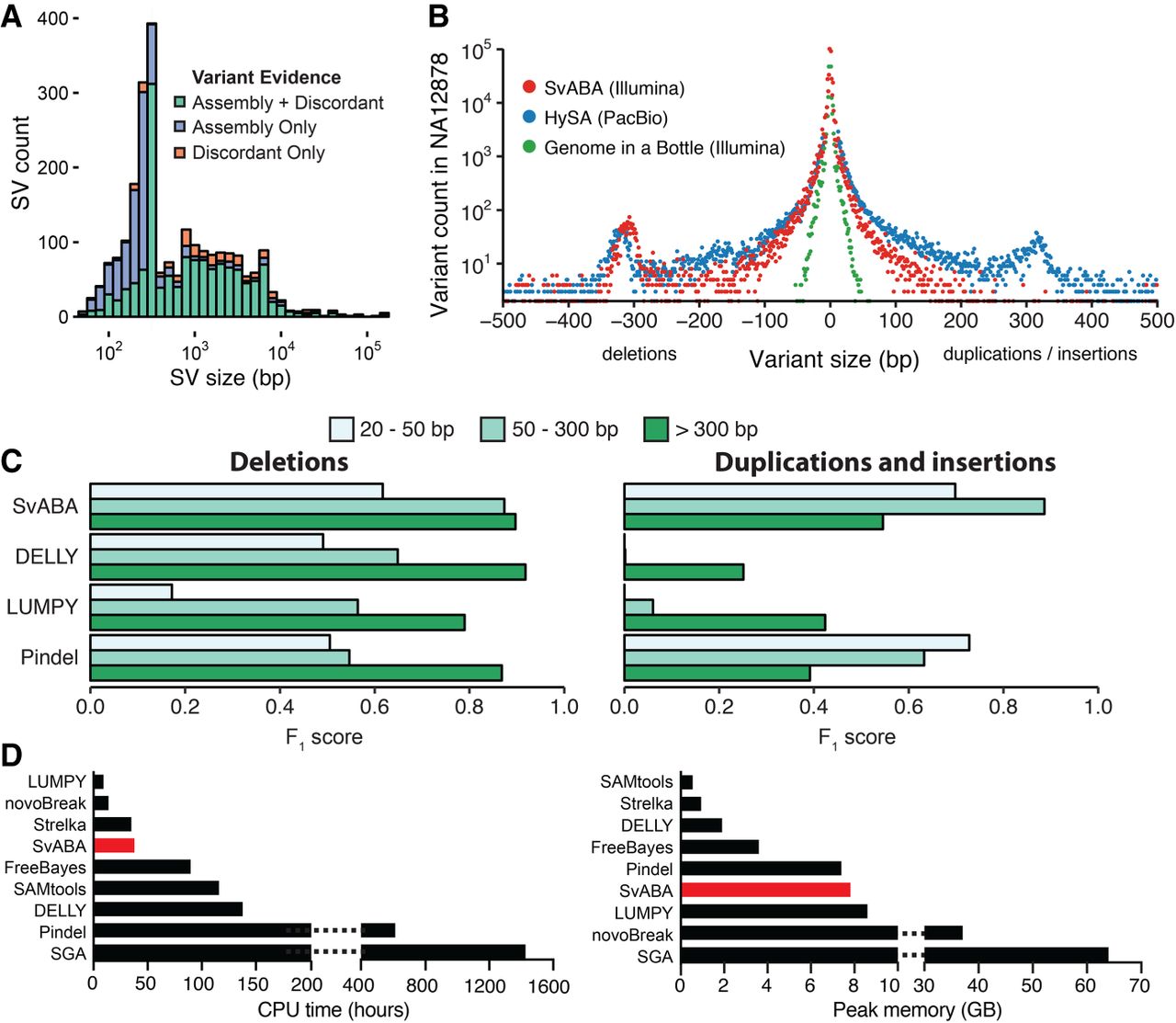 Detection of SVs and indels in the NA12878 human genome. (A) The number of SV events and the types of supporting evidence used by SvABA for detecting SV events of different lengths (indel variants not shown). SVs are detected through realignment of assembly contigs (purple), discordant read clusters (orange), or a combination of both (green). SVs with shorter lengths than the average size of the sequencing fragments are identified almost exclusively through assembly and realignment. (B) The length distributions of indels and small SVs in NA12878 determined from different sequencing and analytical technologies: 151-base paired-end Illumina sequencing by SvABA (red), HySA calls from PacBio sequencing data (blue), and the indel call set of the Genome in a Bottle consortium (green). (C) Comparison of detection accuracy of SvABA, LUMPY, DELLY, and Pindel for deletions (left) and for insertions/duplications (right) across three different length regimes in NA12878. The F1 score is a combined measure of precision and recall and was calculated using the PacBio assemblies and Genome in a Bottle (GIAB) as a truth set. (D) Total CPU and peak memory usage for several indel and SV detection tools applied to a single 33× human genome. SGA CPU and memory usage were estimated using published data (Simpson and Durbin 2012).