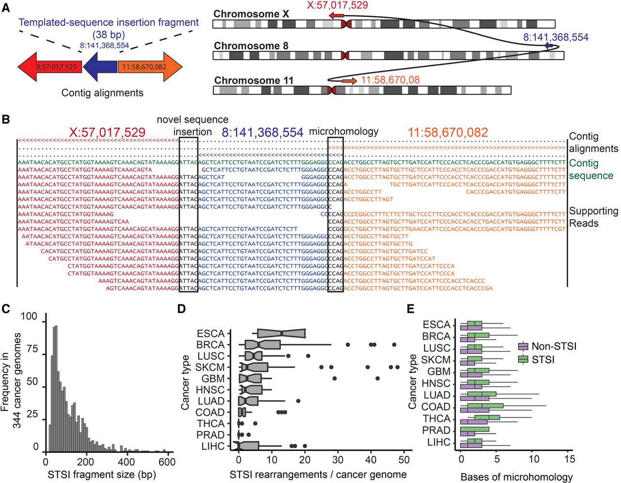 SvABA identifies rearrangements with short templated-sequence insertions (STSI) derived from distant genomic loci. (A) Somatic rearrangement between Chr X and Chr 11 in HCC1143 containing a 38-bp fragment of Chr 8. STSI rearrangements are identified by assembly contigs that have multiple non-overlapping alignments to the reference. The direction of the arrows represents the strand that the contig fragment was aligned to (right-facing is forward strand). (B) Partial view of the contig from A showing the multiple alignments of the contig to the reference and the read-to-contig alignments. The top three lines indicate which bp of the contig each of the three BWA-MEM alignments covers (> is forward strand alignment; < is reverse strand alignment). The first two alignments indicate an insertion of 5 bp of novel sequence at the first junction (left), and the second two indicate 4 bp of microhomology at the second junction (right). The middle alignment supports the STSI fragment. These plots are automatically generated by SvABA for each variant (in the *.alignments.txt.gz file). (C) STSI fragment lengths from somatic rearrangements across 344 cancer genomes (mean 86 bp). (D) Prevalence of STSI rearrangements (x-axis) across 11 tumor types (y-axis). (ESAD) esophageal cancer; (BRCA) breast cancer; (LUSC) lung squamous cell carcinoma; (SKCM) melanoma; (GBM) glioblastoma; (HNSC) head and neck squamous cell carcinoma; (LUAD) lung adenocarcinoma; (COAD) colorectal adenocarcinoma; (THCA) thyroid carcinoma; (PRAD) prostate adenocarcinoma; (LIHC) hepatocellular carcinoma. (E) Bases of breakpoint microhomology (x-axis) for different cancer types (y-axis) for somatic STSI rearrangements (green) and somatic non-STSI rearrangements (purple). The STSI rearrangements have a significantly higher degree of breakpoint microhomology than their non-STSI counterparts across all tumor types.