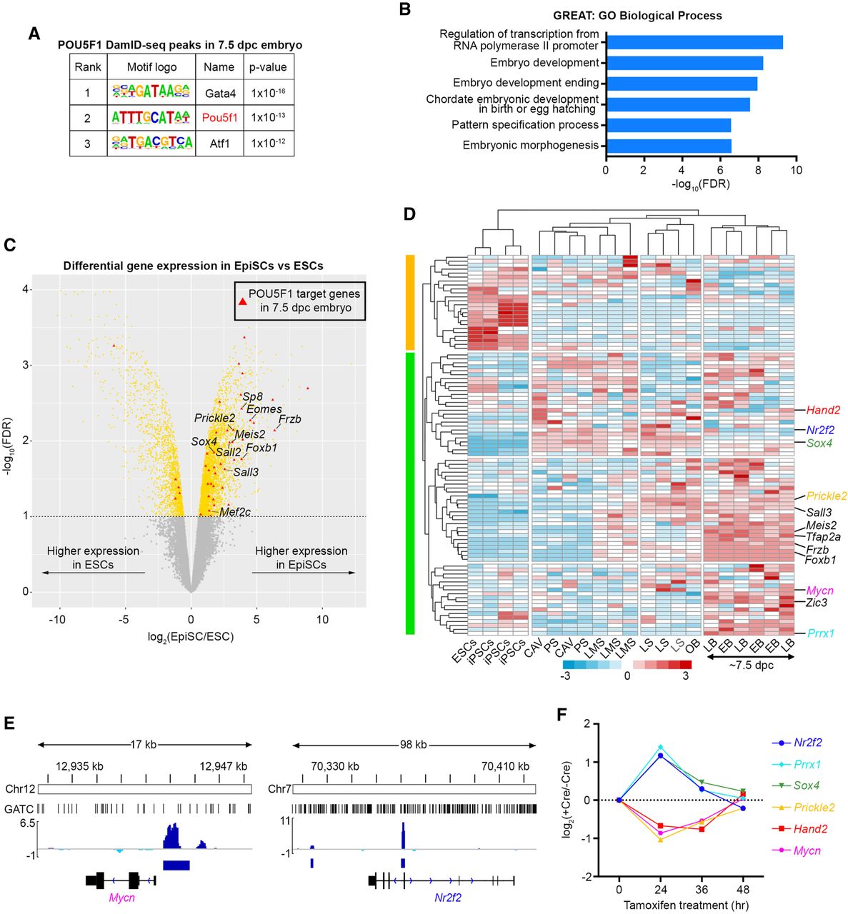 Analysis of POU5F1 target genes in the 7.5-dpc epiblasts. (A) Motif enrichment analysis (Heinz et al. 2010) of the epiblast POU5F1 DamID-seq peaks. (B) GO enrichment analysis of POU5F1 DamID-seq peaks from 7.5-dpc epiblasts using GREAT (McLean et al. 2010). (C) Differentially expressed genes between ESCs and EpiSCs (Tesar et al. 2007). Red triangles represent the POU5F1 binding peak–associated genes in 7.5-dpc epiblasts. (D) Expression levels of the 7.5-dpc epiblast POU5F1 binding peak–associated genes in ESCs and post-implantation epiblasts (Kojima et al. 2014). Genes whose expression significantly changed 24 h after Pou5f1 deletion in the 7.5-dpc mouse embryo (DeVeale et al. 2013) are indicated in color. (CAV) Epiblast of cavity; (PS) prestreak; (LMS) late mid streak; (LS) late streak; (OB) no bud; (EB) early bud; (LB) late-bud. (E,F) POU5F1 binding peaks identified by DamID-seq (E) and expression changes of the development-related six genes upon Pou5f1 deletion in 7.5-dpc embryos (F) (DeVeale et al. 2013).