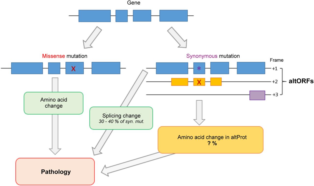 Graphical representation of ways a genetic mutation might cause pathology. Mutations from a single nucleotide variation (SNV) can result either in a missense mutation (red X) or in a synonymous mutation (purple star). Missense mutations are the most studied, as they lead to an amino acid change in the gene's annotated protein sequence. Synonymous mutations are studied mostly for their likelihood to alter splicing sites (about 30% of cases). However, a synonymous mutation in a gene's annotated protein sequence (in blue) might cause an amino acid change in a protein encoded in an alternative open reading frame (altORF/altProt—in yellow). These altered proteins might be a yet unexplored mechanism by which a SNV is pathological.