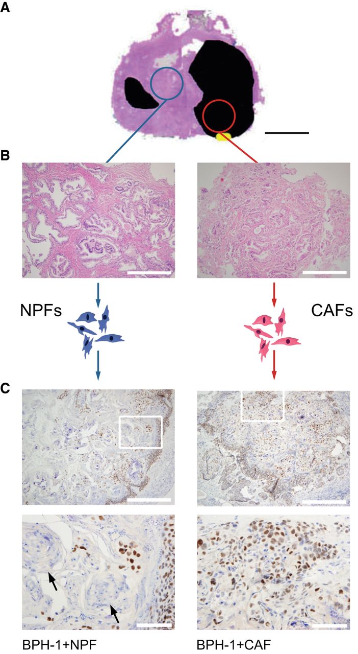 Isolation and validation of matched CAFs and NPFs from patient tissue. Representative data from patient 1. (A) Matched nonmalignant (blue) and cancer (red) tissue were dissected from the same radical prostatectomy specimen and used to establish primary cultures of CAFs and NPFs. (Scale) 2 cm. (B) Hematoxylin and eosin staining confirmed that NPFs were from a nonmalignant region and that CAFs were from a region of Gleason 3+4 cancer. (Scales) 500 µm. (C) Grafts from tissue recombination assays with BPH-1 epithelial cells stained for SV40 T antigen (brown) and nuclei counterstained with hematoxylin (blue). BPH-1 cells combined with NPFs formed well-differentiated structures, evident from organized layers of epithelial cells with abundant keratinization (arrows). In contrast, BPH-1 cells combined with CAFs formed poorly differentiated structures, consistent with tumorigenesis, apparent from the disorganized clusters of epithelial cells and limited keratinization. White boxes indicate the areas shown in higher magnification. (Scales) 500 µm for low magnification images and 100 µm for high magnification images.