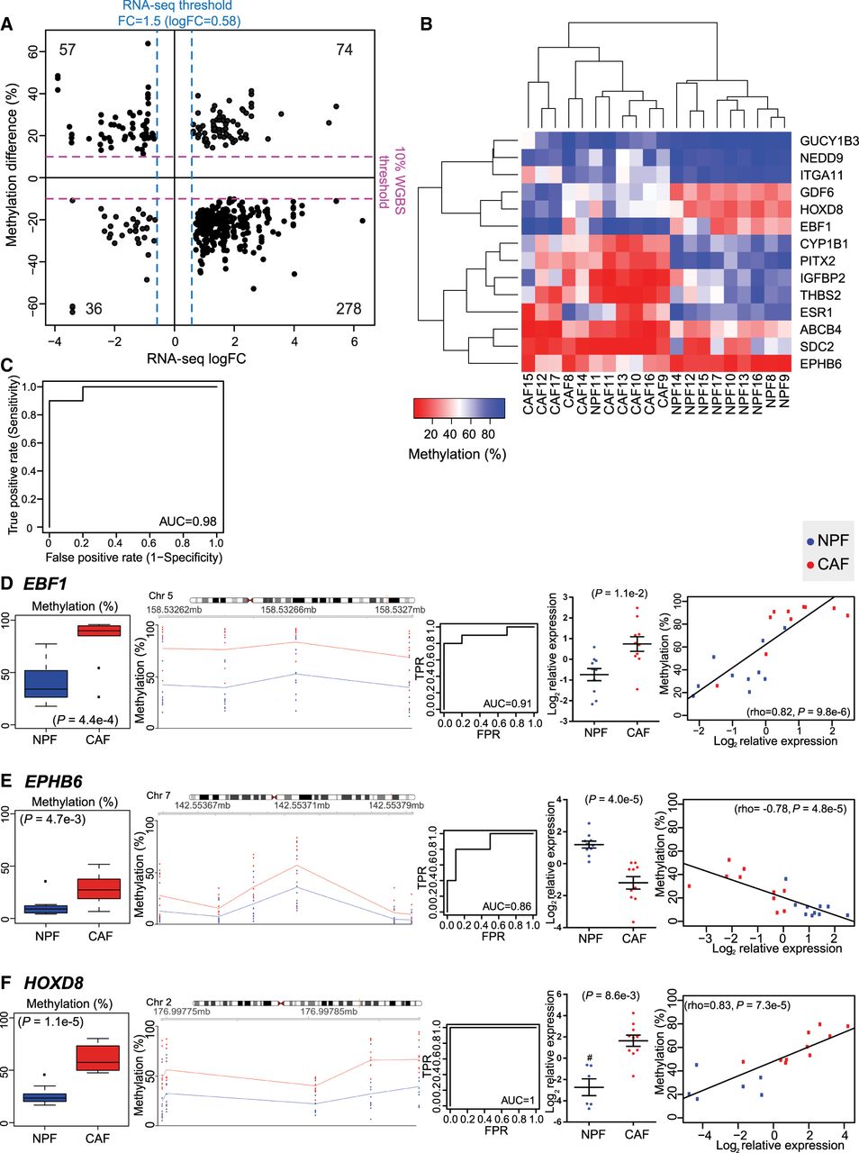 Consistent changes in DMRs associated with differentially expressed genes (DE-DMRs) between patients. (A) Scatter plot of DE-DMRs showing the average percentage difference in DNA methylation versus average log fold change (logFC) in expression (n = 4 CAF-NPF pairs). Dotted lines indicate the thresholds for DE-DMRs. (B) Nonhierarchical clustering of CAFs and NPFs from 10 independent patients based on the methylation status of 14 candidate DE-DMRs. The heatmap shows the percentage of DNA methylation of each DE-DMR in each sample. (C) Receiver operating characteristic (ROC) curve analysis based on the DNA methylation status of the 14 candidate DE-DMRs (AUC = 0.98, n = 10 CAF-NPF pairs). Representative examples of DE-DMRs in the EBF1 (D), EPHB6 (E), and HOXD8 (F) genes ([blue] NPF; [red] CAF), showing the average methylation across the amplicon in CAFs versus NPFs (one-sided paired t-test), the percentage of DNA methylation at each CpG site in each sample (trendlines denote the mean), ROC curves, the relative gene expression in each sample (with mean ± SEM, one-sided t-test), and the significant correlation between methylation and expression (Spearman's test). The # symbol denotes that HOXD8 expression was below the detection limit for NPF10, NPF13, NPF15, and NPF17; therefore, n = 6 for NPFs and n = 10 for CAFs.