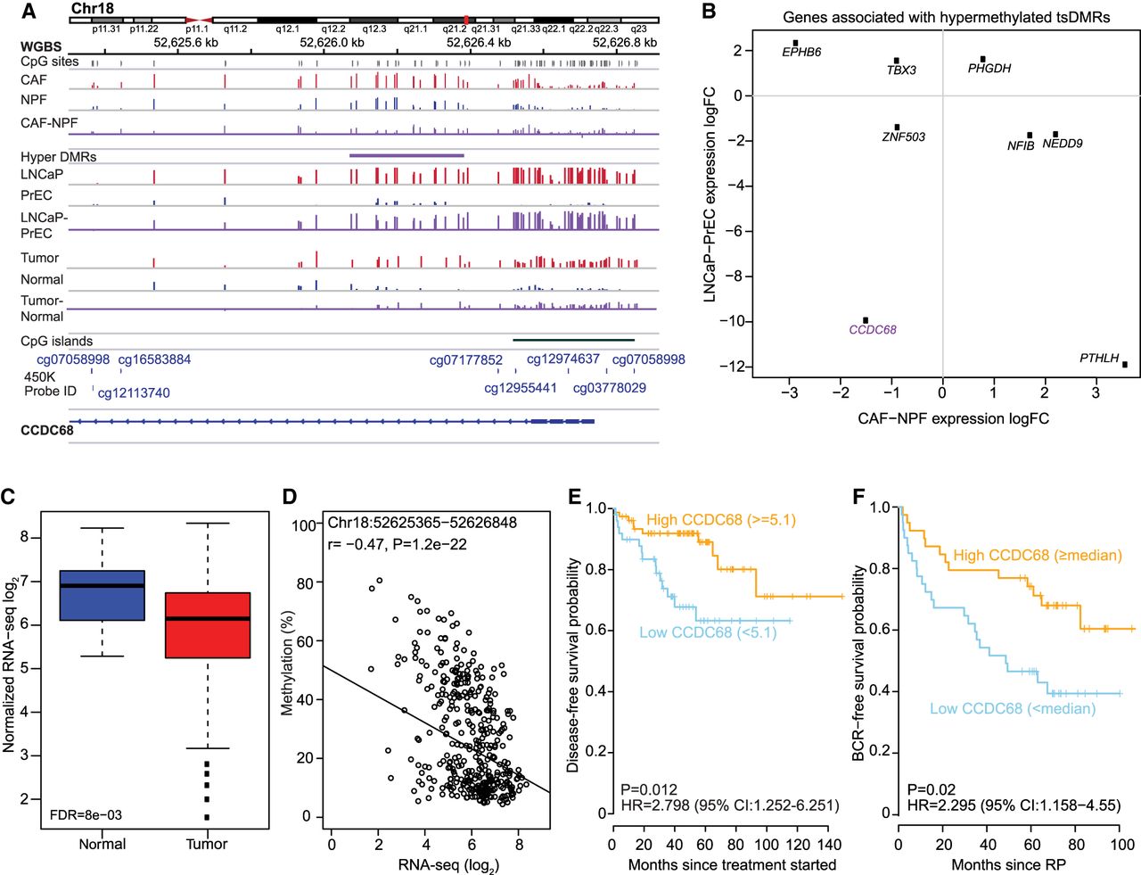 CCDC68 has prognostic value in localized prostate cancer. (A) WGBS data showing consistent hypermethylation of CCDC68 in CAFs versus NPFs (n = 4 pairs), LNCaP versus PrEC, and matched tumor versus normal tissues (n = 4 pairs). The locations of 450K probes are shown in gray. (B) Scatter plot of differentially expressed genes associated with hypermethylated tsDMRs. CCDC68 (purple) is down-regulated in CAFs versus NPFs (n = 4 pairs) and also in LNCaP versus PrEC cells. (C) Box plot showing decreased CCDC68 expression in tumor (n = 392) versus normal (n = 45) tissue samples from TCGA. (D) The relationship between 450K methylation averaged across all probes at the TSS of CCDC68 and gene expression for TCGA tumor specimens. (E,F) Kaplan–Meier curves showing low (blue) CCDC68 expression is associated with poor recurrence-free survival compared to high CCDC68 expression (orange) in Taylor (E) and Glinsky (F) data sets (n = 127 and n = 79 respectively, log-rank test).