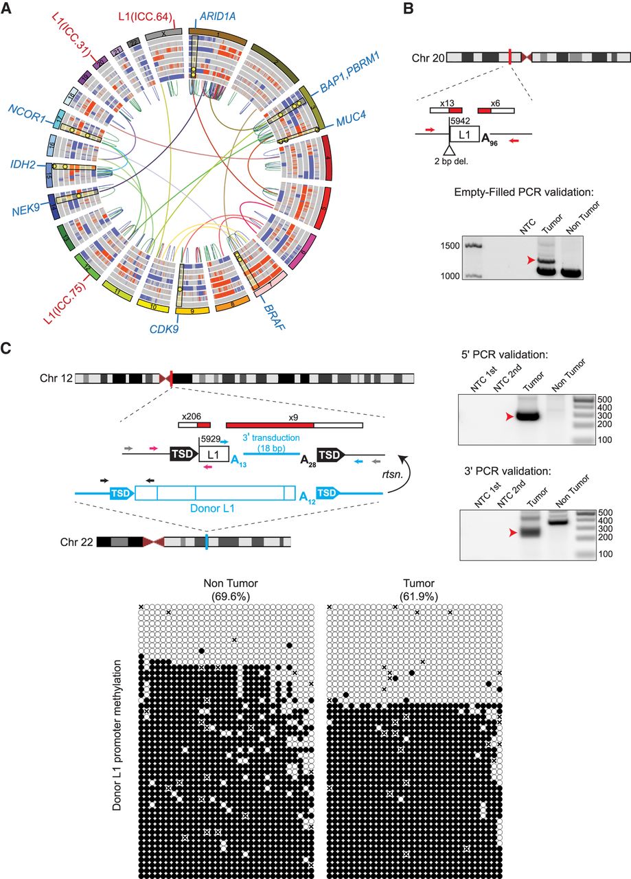 ICC patient tumor mutational landscape, including tumor-specific L1 insertions. (A) Circos diagram (Krzywinski et al. 2009) summarizing ICC somatic mutations including copy number gains (red) and losses (blue), intra-chromosomal (colored by chromosome pair) and inter-chromosomal (red = duplication, blue = deletion, green = inversion) rearrangements. Rearrangements shown are those that intersect genes identified in prior ICC studies or present in the COSMIC Cancer Gene Census. L1 insertions are highlighted in red text labels on the outside of the circle, and selected genes with somatic mutations are highlighted with blue labels. Selected somatic mutations (SNVs and INDELs) are shown as yellow dots with highlights superimposed on the copy number variation rings. (B,C) Detailed characterization of two intergenic and 5′ truncated tumor-specific L1 insertions. For each insertion, the chromosomal location is shown. L1 insertions are depicted as white rectangles; the truncation point of each insertion is indicated. The location and count of junction-spanning RC-seq and WGS reads supporting each insertion are depicted as red and white rectangles. Target-site duplications are shown as black arrows; deletions of genomic DNA are shown as white triangles. Poly(A) tail length is indicated. The positions of PCR validation primers are shown as small arrows. Where empty-filled validation was successful, primers are indicated in red. Where junction PCRs were employed, primers are depicted in pink (5′ junction) and blue (3′ junction). Where hemi-nested PCR was necessary, the outer primer(s) are depicted in gray and the inner primers are depicted in color. Agarose gels containing the empty/filled or 5′ and 3′ junction validation products are shown. Templates are indicated above; for hemi-nested PCR reactions, NTC 1st and NTC 2nd depict the no-template control reactions for the first and second rounds of PCR. Red arrows indicate the validating band. The L1 insertion shown in C carried an 18-bp 3′ transduced sequence implicating a donor L1 (shown in blue) located in the TTC28 gene on Chromosome 22. The methylation state of this specific donor L1 (below) was determined via targeted bisulfite sequencing of its promoter CpG island (primers are depicted in C as black arrows). Each cartoon represents 50 random, nonidentical sequences matching the donor L1 (black circle, methylated CpG; white circle, unmethylated CpG; “x,” absent) obtained from patient ICC.75 nontumor liver and matched tumor.