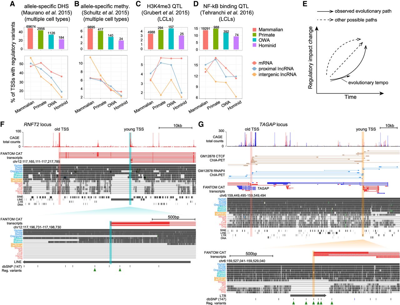 Temporal and spatial constraints on the regulatory evolution of young TSSs. (A) (Top) Proportion of TSSs harboring regulatory variants associated with allele-specific DHS within TSS ± 1 kb for each TSS group; numbers above bars indicate the numbers of TSSs with regulatory variants. (Bottom) Proportions of TSSs harboring regulatory variants in different TSS subgroups, defined by transcript type. (B) Proportion of TSSs harboring variants associated with allele-specific methylation within TSS ± 1 kb. (C) Proportion of TSSs harboring H3K4me3 QTLs within TSS ± 1 kb. Data generated from lymphoblastoid cell lines (LCLs). (D) Proportion of TSSs harboring NF-kb complex binding (RELA ChIP) QTLs within TSS ± 1 kb. (E) Schematic illustration depicting different possible paths for regulatory evolution of young TSSs. (F) Genome browser view of a young TSS cis-proximal to old TSSs. (Top) FANTOM CAT transcript models (red for forward-strand, blue for reverse-strand); genomic alignments and TE annotations obtained from the UCSC Genome Browser. (Bottom) Enlarged region of an “OWA” TSS inside a LINE element. Beneath the alignments are the common SNPs (allele frequency ≥0.01) from dbSNP database and SNPs associated with regulatory variation. (G) A young TSS trans-proximal to old TSSs. (Top) Similar to F but with additional CTCF and RNAP II ChIA-PET data for GM12878 cell line. (Bottom) Enlarged region of the young TSS. Below the alignments are the common SNPs (allele frequency ≥0.01) and regulatory variants.
