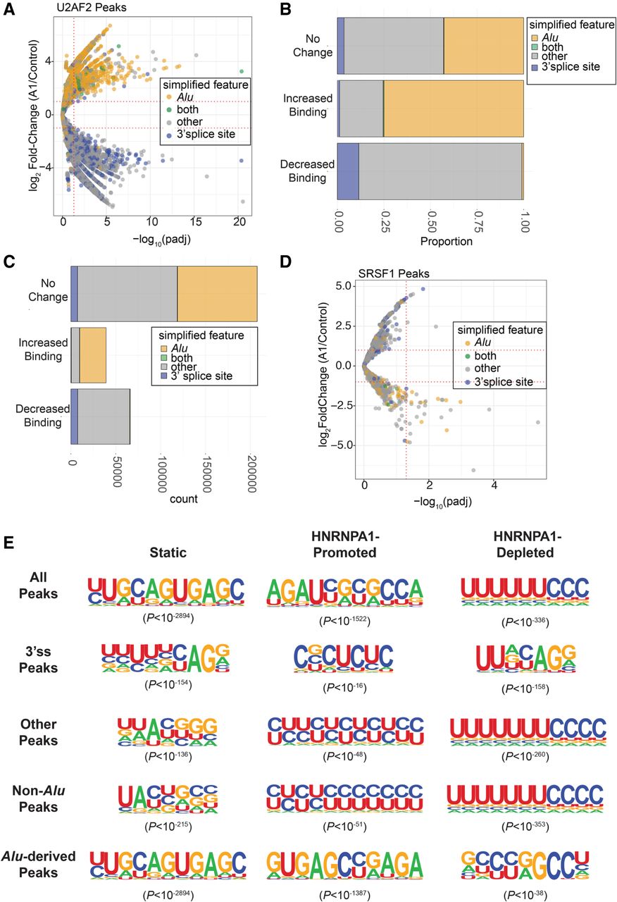 Analysis of global changes in U2AF2 binding site and consensus motifs in control and HNRNPA1 overexpression cells. (A) Volcano plot representing the log2(fold-change) in U2AF2 crosslinking peaks (HNRNPA1 overexpression/control) found within Alu elements, 3′ splice site regions, both Alu and 3′ splice site regions (both), or other regions outside of these (other). These fold-changes are plotted against their corresponding –log10(adjusted P-value) associated with each fold-change. Horizontal dotted lines are associated with a log2(fold-change) of ±2 and between HNRNPA1 overexpression versus control samples. Vertical dotted lines are associated with −log10(adjusted P-value) corresponding to 0.05. (B) Stacked bar graph showing the proportion of U2AF2 crosslinking peaks showing no change (top), increased crosslinking peaks (Increased Binding), or decreased crosslinking peaks (Decreased Binding) found within Alu elements, 3′ splice site regions, both Alu and 3′ splice site regions (both), or other regions outside of these (other). (C) Stacked bar graph showing the total count of U2AF2 crosslinking peaks showing no change (top), increased crosslinking peaks (Increased Binding), or decreased crosslinking peaks (Decreased Binding) found within Alu elements, 3′ splice site regions, both Alu and 3′ splice site regions (both), or other regions outside of these (other). (D) Volcano plot representing the log2(fold-change) in SRSF1 crosslinking peaks found within Alu elements, 3′ splice site regions, both Alu and 3′ splice site regions (both), or other regions outside of these (other). (E) HOMER-generated exemplar U2AF2 motifs associated with static (left), HNRNPA1-disrupted (middle), and HNRNPA1-promoted (right) crosslinking peaks at 3′ splice sites with HNRNPA1 overexpression. Associated P-values for each motif are provided in parentheses.