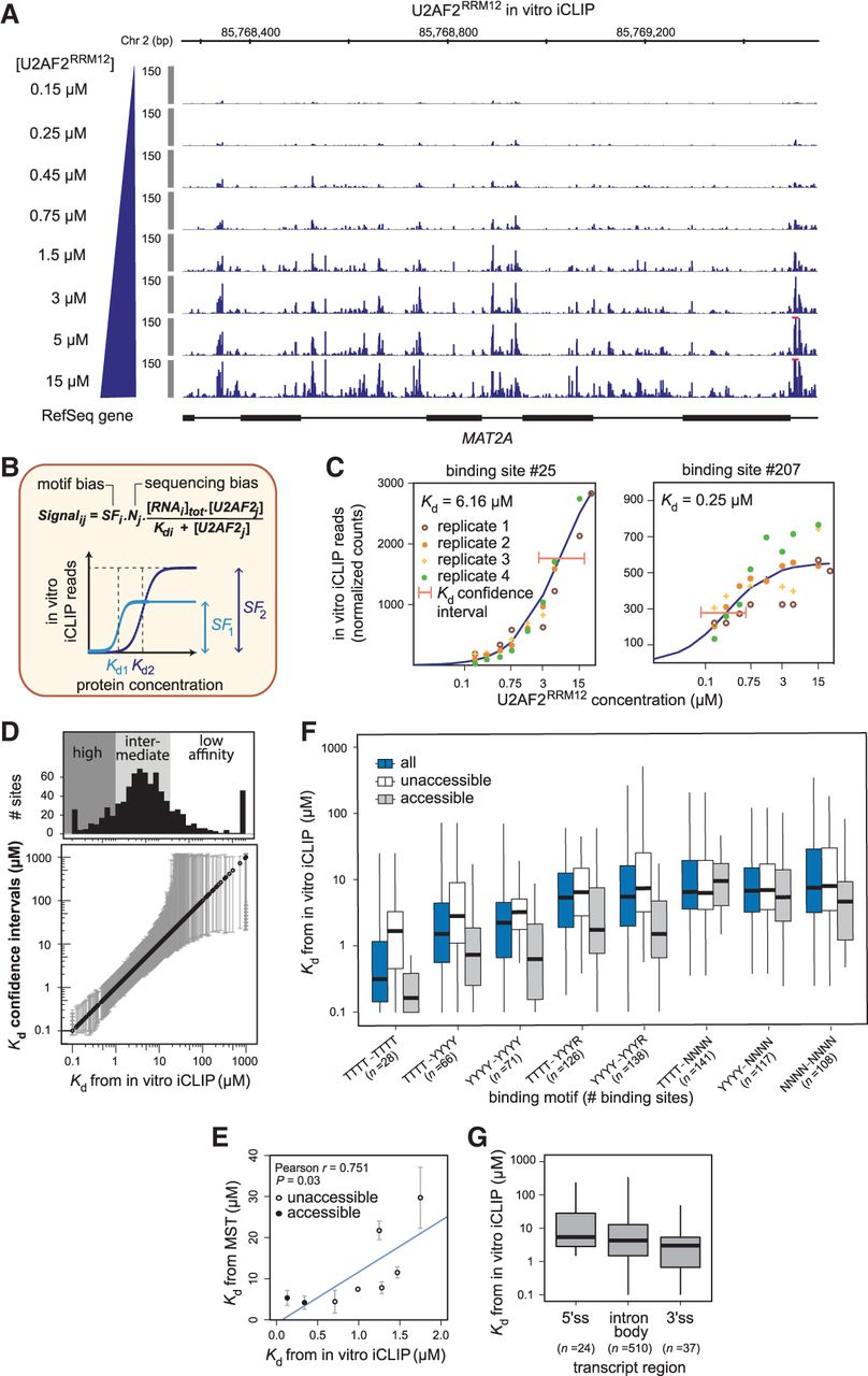 Binding site affinities can be extracted from in vitro iCLIP titration experiments. (A) Titration experiments with increasing U2AF2RRM12 concentrations (0.15–15 µM). Genome browser view of normalized U2AF2RRM12 in vitro iCLIP signal in MAT2A. Red bars indicate values beyond the displayed data range. (B) Kd values were extracted by modeling the read counts from in vitro iCLIP as a function of RNA and U2AF2RRM12 concentrations. A scaling factor (SF) and a normalization factor (N) account for motif and sequencing biases, respectively. Schematic titration curves show two binding sites with lower or higher affinity and/or crosslinking efficiency (dark or light blue, respectively). (C) Titration curves for an intermediate-affinity (left) and a high-affinity binding site (right) (numbers above relate to Supplemental Table S2). Best-fit curves (dark blue) and confidence intervals for the estimated Kd values (orange lines) based on four replicate experiments. (D, lower panel) Plot showing all Kd values from in vitro iCLIP in increasing order (black circles) with their confidence intervals (gray lines). (Upper panel) Histogram of binding sites along the range of Kd values. Binding sites were divided into 120 high-affinity binding sites (Kd < 1 µM), 513 intermediate-affinity sites (1 ≤ Kd ≤ 18 µM), and 162 low-affinity sites (Kd > 18 µM). (E) Kd values from in vitro iCLIP are correlated with microscale thermophoresis (MST) measurements for eight selected binding sites (Supplemental Table S3). Binding sites are marked as accessible (gray) or unaccessible (white) based on RNA fold predictions (see Methods). Pearson correlation coefficient (r) and associated P-value indicated above. (F) Kd values from in vitro iCLIP are proportionate to the underlying pyrimidine content. Binding sites were stratified based on different 8-mers within a 17-nt window (blue; number of binding sites within each category in brackets), and further subdivided into unaccessible (white) or accessible (gray) as in F. (G) Affinities at 3′ splice sites do not significantly differ from other transcript regions. Bar plot showing the distribution of Kd values from in vitro iCLIP for U2AF2 binding sites in different transcript regions.