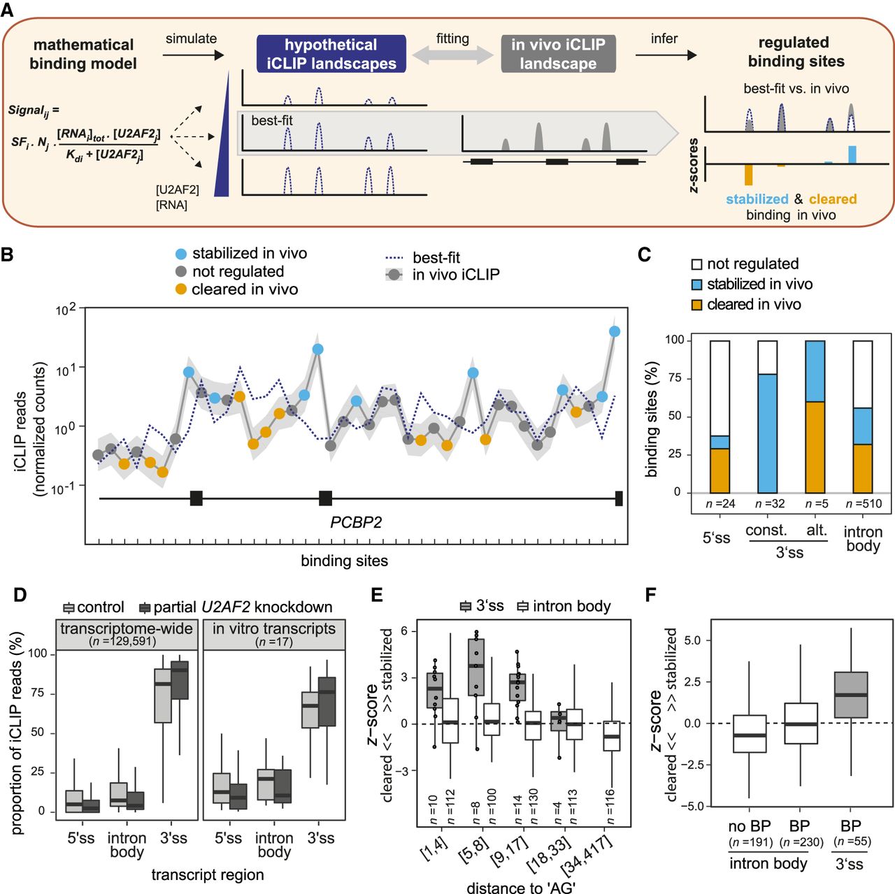 Comparative modeling of in vitro and in vivo binding reveals numerous sites of U2AF2 regulation. (A) Schematic of in vitro–in vivo fitting to identify regulatory hotspots. Best-fit was obtained by comparing the in vivo binding to hypothetical landscapes that were simulated from the mathematical model of U2AF2RRM12 in vitro binding based on identified Kd values and varying RNA and U2AF2 concentrations. Discrepancies between best-fit and in vivo binding landscape (z-score) were used to infer stabilization (blue) and clearance (orange) in vivo. (B) Comparison of best-fit (dotted blue line) and in vivo landscape (gray line) on PCBP2 showing stabilized (blue) and cleared (orange) U2AF2 binding sites. Gray shadow represents standard deviation of in vivo iCLIP read counts from three independent replicates. (C) The majority of U2AF2 binding sites are regulated. Plot showing the proportion of nonregulated (|z-score| < 1; white), stabilized (z-score > 1; blue), and cleared (z-score < −1; orange) binding sites in different transcript regions (5′ splice sites, constitutive or alternative 3′ splice sites, and intron body). (D) U2AF2 binding is most efficiently maintained at 3′ splice sites upon partial U2AF2 knockdown (KD). Bar plot showing the proportion of U2AF2 in vivo iCLIP reads in control cells (light gray) and upon partial U2AF2 KD (dark gray) for binding sites in different transcript regions. Analyses across transcriptomes (left) as well as restricted to nine tested in vitro transcripts (right) are shown. (E,F) A nearby AG dinucleotide or branch point (BP) motif is not sufficient to explain the substantial U2AF2 stabilization at 3′ splice sites. (E) Box plot showing the z-score distribution of U2AF2 binding sites at 3′ splice sites (gray) and in intron bodies (white). Binding sites were separated into six roughly equal-sized bins with increasing distance to the next AG dinucleotide (between 1 nt and 417 nt; indicated as ranges below). Individual data points are shown for n < 15. (F) Box plot as in E for binding sites without BP (n = 191 binding sites), with upstream BP motif (n = 230), and with upstream BP motif and adjacent 3′ splice site (n = 55).
