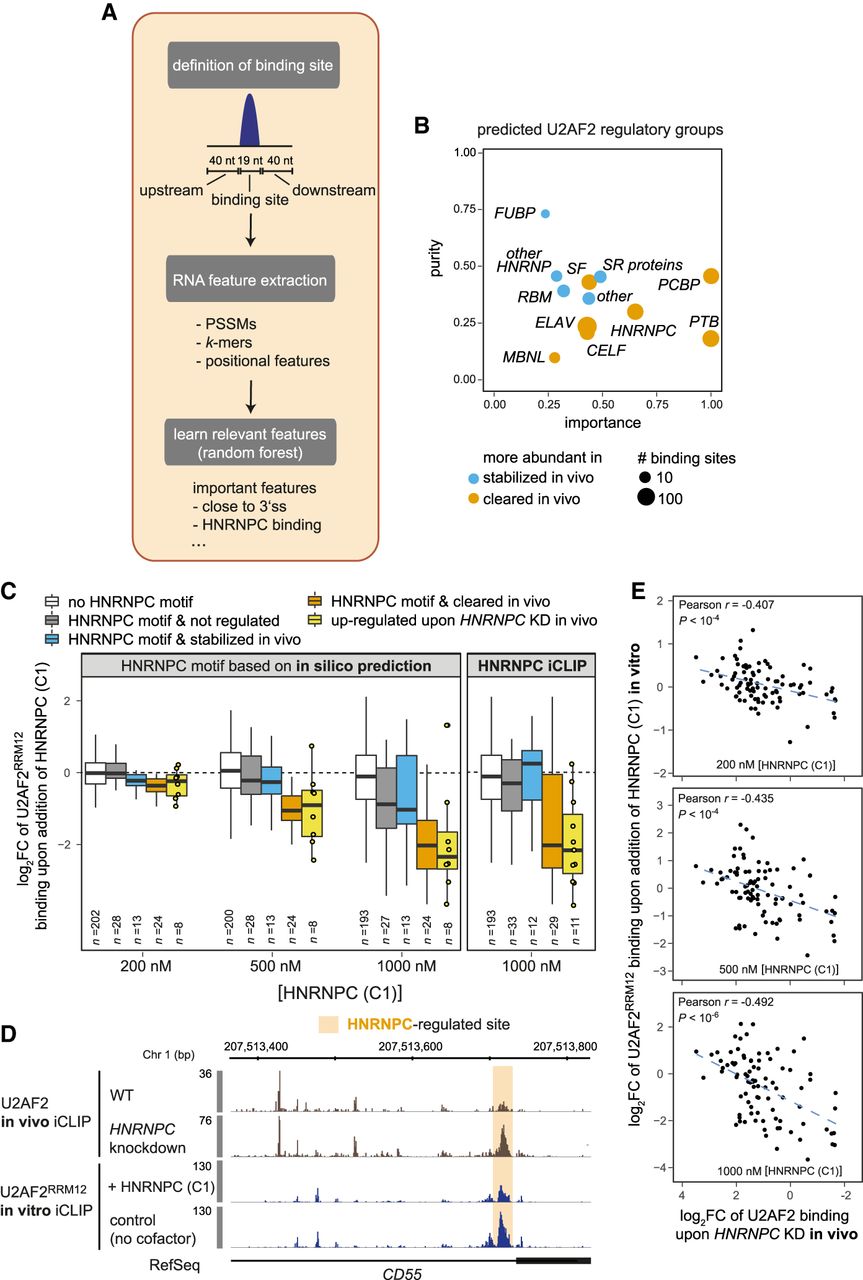 Random Forests machine learning reveals possible regulators of in vivo U2AF2 binding. (A) Schematic workflow of the Random Forests approach that learns the most relevant features to classify U2AF2 binding sites into stabilized (z-score > 1, 151 sites) or cleared (z-score < −1, 173 sites) in vivo. (B) Twelve regulatory groups are identified as top candidates for in vivo U2AF2 regulation. Plot contrasting the relative importance and purity of collapsed regulatory groups from the top 100 features obtained by Random Forests analysis. Purity indicates specificity of association with a certain direction of regulation (see Supplemental Material). Circle diameter represents scaled number of sites with predicted binding sites of a representative RBP from the group for the predominant direction of regulation (blue = stabilized in vivo, orange = cleared in vivo). (C) HNRNPC (C1) suppresses U2AF2RRM12 binding specifically at sites that are down-regulated in vivo and show overlapping HNRNPC binding according to in silico predictions (left panel) or HNRNPC in vivo iCLIP data (right panel). Box plots of log2-transformed fold-changes (log2FC) of normalized U2AF2RRM12 read counts from in vitro iCLIP cofactor assays with different concentrations of recombinant HNRNPC (C1) (200, 500, and 1000 nM) over a control with U2AF2RRM12 alone. U2AF2 binding sites are subdivided into sites without HNRNPC (white) and sites with HNRNPC but not regulated in vivo (z-score < |0.5|; gray), stabilized in vivo (z-score > 1; blue), or cleared in vivo (z-score < −1; orange). An additional box summarizes all sites with decreased U2AF2 binding upon HNRNPC KD in vivo (log2FC < −1; yellow) (Zarnack et al. 2013). Individual data points are shown for n < 11. (D) In vitro iCLIP recapitulates in vivo competition between HNRNPC and U2AF2. Genome browser view of U2AF2 in vivo iCLIP data (brown) from control and HNRNPC knockdown HeLa cells (Zarnack et al. 2013), as well as in vitro iCLIP data (blue) for U2AF2RRM12 alone (control) and upon addition of recombinant HNRNPC (C1) at HNRNPC-regulated alternative exon of CD55. Orange shading highlights HNRNPC-regulated site. (E) HNRNPC triggers similar regulation of U2AF2 binding in vivo and in vitro. Scatter plots comparing log2FC upon in vitro addition of HNRNPC (C1) (HNRNPC (C1) + U2AF2RRM12/U2AF2RRM12) with log2FC of U2AF2 in vivo iCLIP read counts upon HNRNPC KD (KD/control) for three different concentrations of recombinant HNRNPC (C1). Pearson correlation coefficients (r) and associated P-values are given.