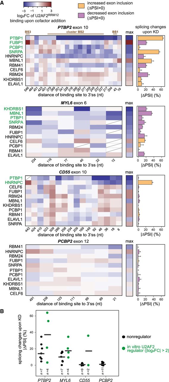In vitro changes predict in vivo regulation of alternative splicing. (A) Changes in U2AF2RRM12 binding in vitro coincide with effects on alternative exon inclusion upon KD of individual cofactors. (Left panel) Heat maps showing log2FC of normalized in vitro U2AF2RRM12 read counts upon cofactor addition (U2AF2RRM12 + cofactor/U2AF2RRM12) for binding sites within 600 nt of the 3′ splice sites of four alternative exons (PTBP2 exon 10, MYL6 exon 6, CD55 exon 10, and PCBP2 exon 12; note that the preceding introns in MYL6 and PCBP2 are only 304 nt and 510 nt in length, respectively). Cofactors in each heat map are ordered by the maximum change in U2AF2RRM12 binding at any site in vitro (summarized in the middle panel). Binding sites with low coverage are marked with a diagonal line or completely removed if present in less than half of the KD samples. (Right panel) Bar chart showing absolute changes in exon inclusion (percent spliced in, PSI) in vivo upon KD of individual cofactors. Colors indicate direction of splicing change (orange, up-regulation upon KD; purple, down-regulation). Based on their maximum effect on U2AF2RRM12 binding in vitro, cofactors were subdivided into “in vitro U2AF2 regulators” (green, maximal |log2FC| > 2 in U2AF2RRM12 binding upon cofactor addition) and “nonregulators” (white, maximal |log2 FC| ≤ 2). Error bars represent standard deviation of the mean (n = 3). (B) Cofactors that significantly influence U2AF2RRM12 binding in vitro trigger stronger splicing changes in vivo. Dot plot showing ΔPSI upon cofactor KDs for four alternative exons. Coloring of in vitro U2AF2 regulators and nonregulators as in A.