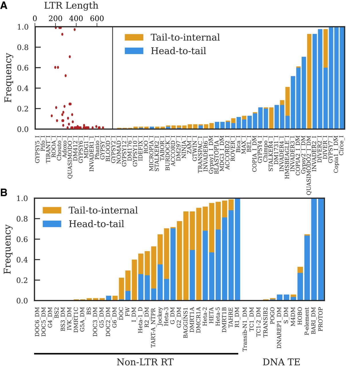 The proportion of GDL strains in which a tandem junction was identified for LTR retrotransposon families (A) and non-LTR retrotransposon families and DNA transposon families (B). Head-to-tail tandems have junctions involving the first and last 200 nt of the consensus sequence. Tail-to-internal junctions have junctions between the last 200 nt of the consensus sequence and internal sequence; these are consistent with tandems involving 5′-truncated elements, though they can also be formed by nested insertions. We do not depict the frequency of internal-to-internal tandems because they are present in most strains, but generally at low copy number; Supplemental Figure S5 provides a more informative visualization of internal-to-internal tandem variation. A does not include LTR–LTR junctions shown in Supplemental Table S2. The scatter plot inset in A depicts the relationship between LTR length and the frequency of detecting head-to-tail tandems for each LTR retrotransposon family.