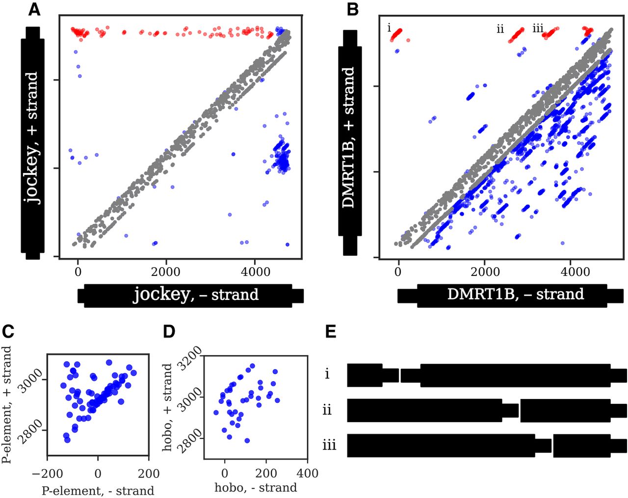 Junction distributions from all strains in the GDL for two non-LTR retrotransposons (A,B) and two DNA transposons (C,D). Note that C and D only show head-to-tail tandem distributions, and thus, the axes only include the terminal regions. Each dot represents a junction identified from a single strain. A junction present in multiple strains will generate a diagonal distribution around the true coordinate due to estimation errors. In A and B, head-to-tail and tail-to-internal tandem junctions are highlighted in red, internal-to-internal tandems and deletions are colored in blue, and probable artifacts are colored in gray (see Methods, “Categorizing Tandem Junctions”); all junctions in C and D are head-to-tail. The distribution of tandem junctions of jockey (A) are dispersed, with few distinct diagonal clusters, indicating that most individual tandem junctions are low-frequency. In contrast, the four distinct diagonal clusters of DMRT1B (B) indicate junctions at moderate to high population frequency, suggesting that they represent older tandems. While not the focus of our analysis, internal deletions ranging from low to high frequency are also evident in both A and B as junctions below the main diagonal, with several distinct deletion variants of jockey sharing similar sequence coordinates and with many distinct deletions identifiable in DMRT1B. (C) For the P-element, most junctions fall within a single tight diagonal cluster, consistent with their representing tandem P-elements separated by an 8-bp target site duplication. Several junctions are dispersed above this cluster, consistent with additional sequence of variable length within the junction. (D) In contrast, only a few hobo junctions form a tight diagonal cluster, while most are dispersed below the cluster, consistent with small internal deletions spanning most of the tandem junctions. (E) Schematics of the head-to-tail and tail-to-internal DMRT1B tandems denoted with i–iii in B.