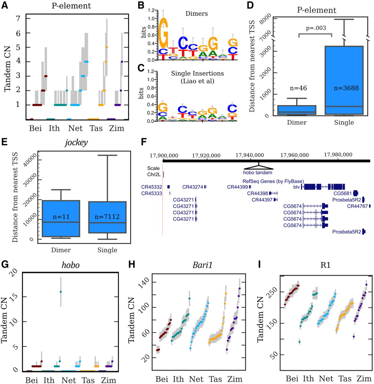 Copy number, location, and sequence of TE tandem junctions. (A) Copy number (CN) distributions for the P-element. The dots are maximum a posteriori estimates in a particular strain, while the gray lines indicate 98%-credible intervals. (B,C) Sequence logos constructed from the 8-nt motifs found within the junctions of P-element tandem dimers (B) and the P-element TSDs described by Liao et al. (2000) (C). (D) A boxplot depicting the distances to the nearest TSS for P-element dimers and single insertions. (N) Counts of insertions in each category; (p) Kolmogorov–Smirnov test. (E) A similar plot for jockey elements; there is no significant difference between singles and dimers. (F) A UCSC Genome Browser view of the region on Chromosome 2L inferred to contain the hobo tandem array in strain I03, with the site of the hobo tandem added in as a black triangle. (G–I) CN distributions for hobo (G), Bari1 (H) and R1 (I) tandems. The dots are maximum a posteriori estimates in a particular strain, while the gray lines indicate 98%-credible intervals.