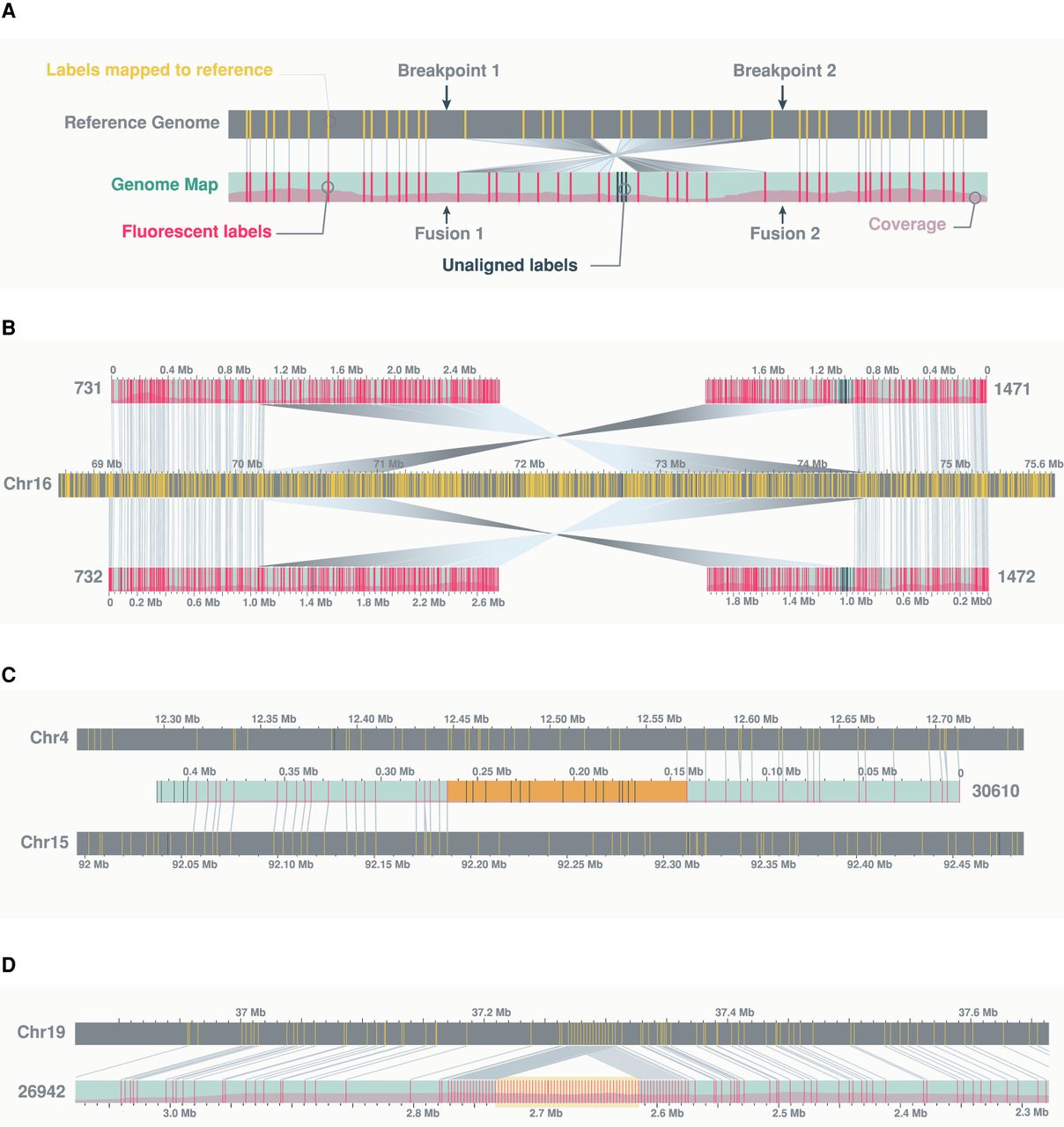 Examples of structural variants. (A) A schematic showing a genomic inversion as characterized by two breakpoints in the reference genome and two fusion junctions in the rearranged genome. (B) An example of a fully resolved 4-Mb inversion, characterized by two pairs of optical maps, each carrying one fusion junction with flanking fragments aligning in opposing directions to one side of the two reference breakpoints. (C) An example of a translocation between Chromosomes 4 and 15, showing “complex” label patterns at the rearrangement junction (highlighted in orange). (D) An example of a 159-kb insertion, showing “repeat” label patterns of the inserted fragment (highlighted in yellow). In this case, the repeat corresponds to the SST1 satellite. Additional examples highlighting complex label patterns at translocation junctions relative to repetitive label patterns of insertions can be found in Supplemental Figure S7. The schema in this figure follows the same convention as outlined in Figure 1. Matching labels between sample and reference genome maps are connected by gray lines. For clarity, any additional genome maps aligning to the reference regions of interest are hidden from view.