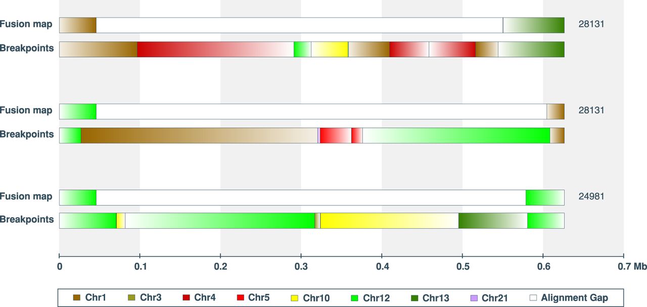 Traversal of optical mapping fusions using short-read sequencing breakpoint calls. Complex rearrangements of many small genomic fragments result in gaps in the fusion maps, because these fragments are too small to be uniquely aligned to the reference genome. Of the 86 optical mapping gaps traversed (348 kb mean gap length), the length of breakpoint traversals differed by 2024 bp on average. Shown are three examples of fusion gaps >0.5 Mb encompassing 6–9 GRIDSS breakpoints.