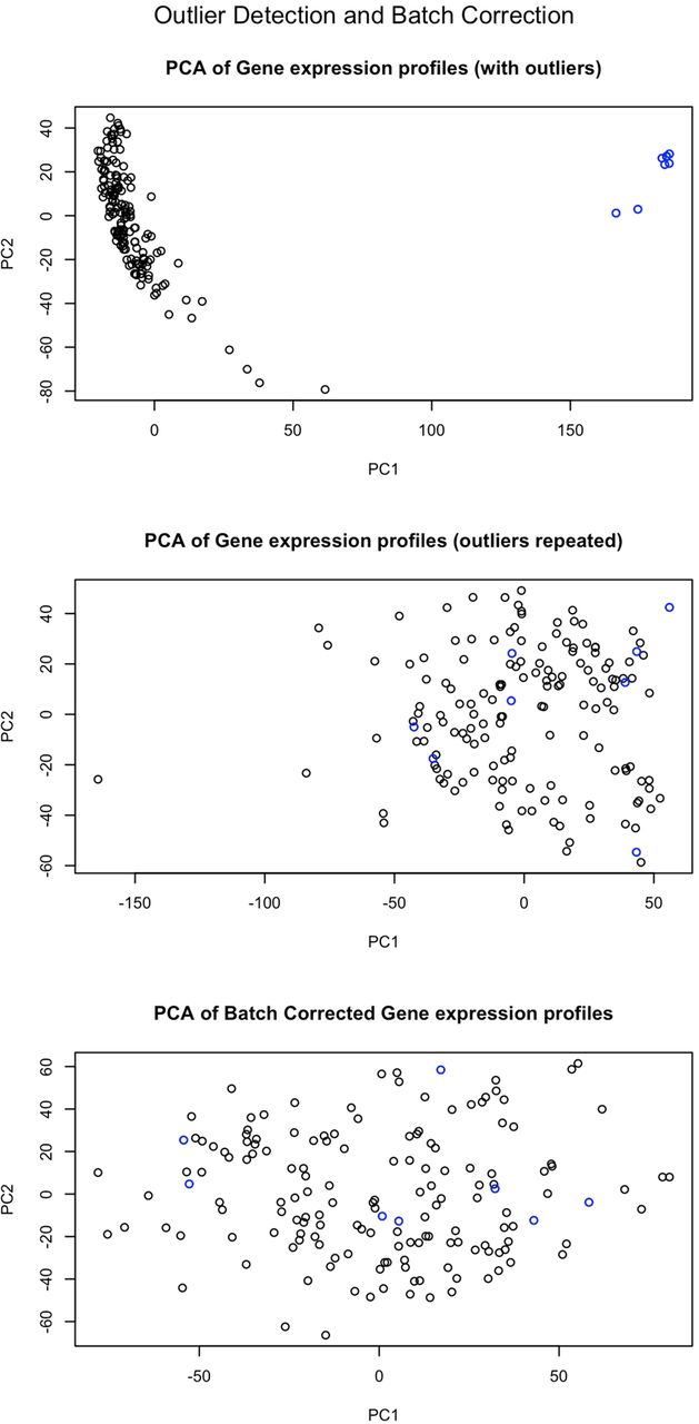 PCA plots of the expression data with the outliers shown in blue. The top plot shows the separate clustering of these samples, and the other plots show how outliers have been removed and that the repeated experiments have improved quality.