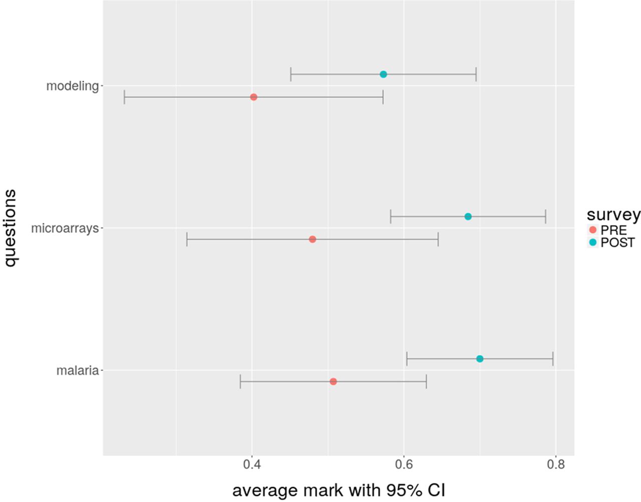 Average normalized survey marks with confidence intervals for the three broad categories of questions, at the beginning (survey “PRE”) and at the end (survey “POST”) of the hackathon.