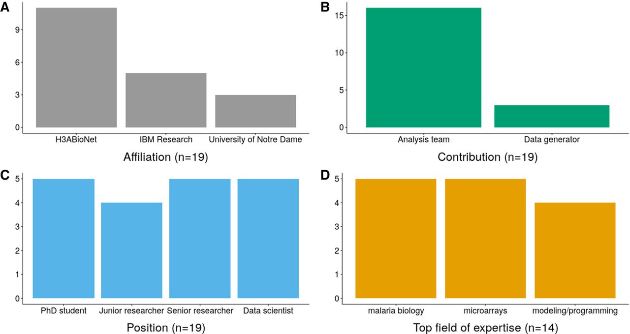 Breakdown of the 19 participants of the hackathon: (A) affiliation of the participants; (B) contribution to the hackathon; (C) type of position in their home institution; and (D) top field of expertise (data here are only for the 14 participants that filled both entry and exit surveys).