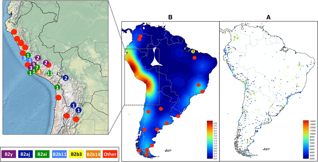 (A) Age in years (see colored legend inset) and location of archaeological sites in South America according to Goldberg et al. (2016). (B) Interpolated kernel density map (units are expressed as the square decimal degree) from the archaeological data in Goldberg et al. (2016); dots indicate the sampling points of ancient specimens and the availability of mtDNA data. While red dots indicate mtDNA lineages other than those analyzed in the present study, other colors signal the presence and number of the B2 lineages analyzed here (see the legend inset).