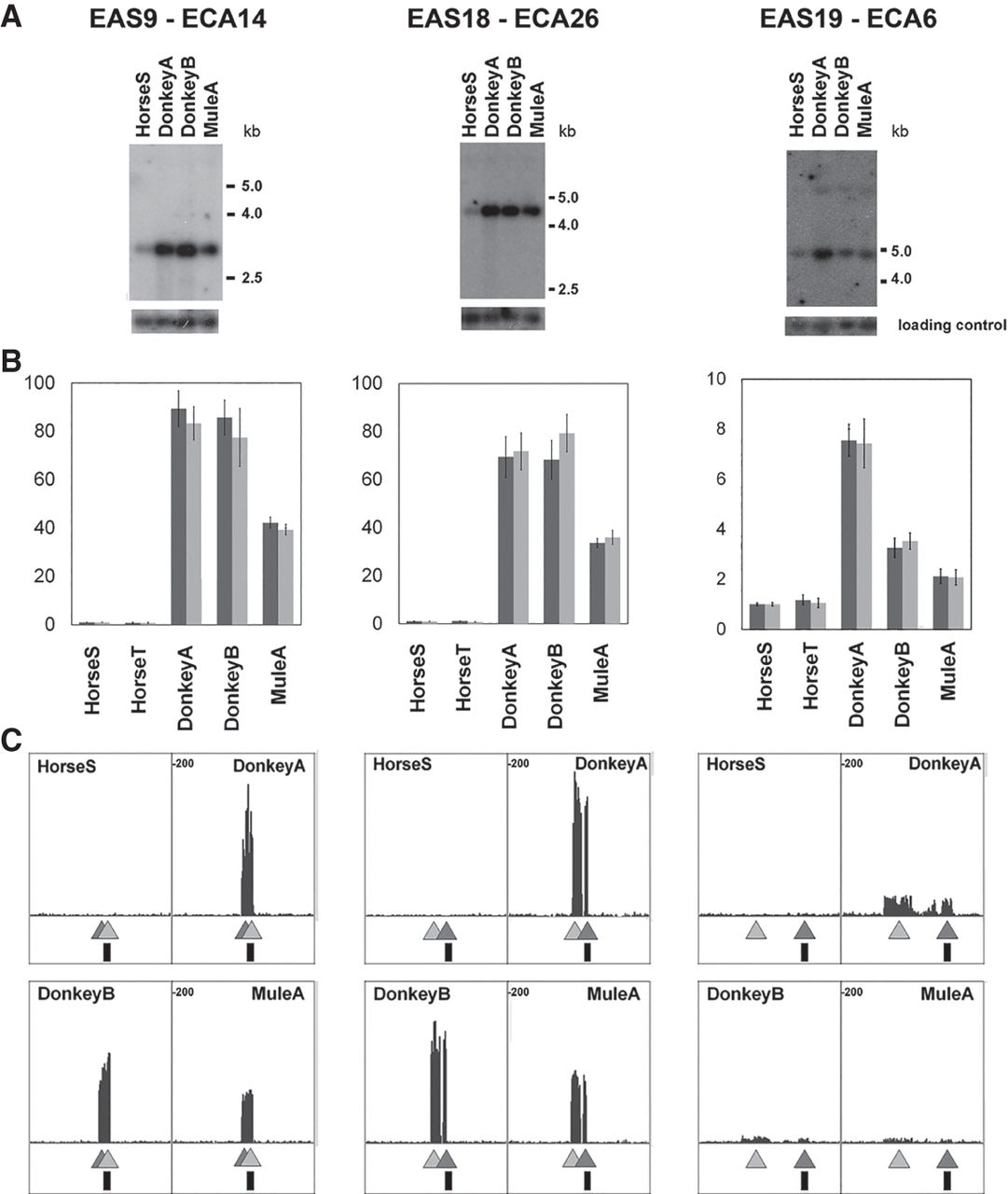 DNA sequence amplification at the centromeres of E. asinus Chromosomes 9, 18, and 19. The number of the E. asinus chromosome (EAS) and of its ortholog in E. caballus (ECA) is reported on top. (A) Southern blot analysis of genomic DNA from one horse, two donkeys, and a mule (MuleA, offspring of DonkeyB). The probes were obtained by PCR-amplification of a portion of the unit repeated in the donkey (Supplemental Table S4). Map positions of the probes are indicated as vertical black rectangles in C. (B) Quantitative PCR performed on DNA from two horses, two donkeys, and one mule. Each centromere was analyzed with two primer pairs (dark and light gray bars) (Supplemental Table S4). (C) Profile of input reads from one horse, two donkeys, and one mule aligned on the horse reference genome. The genomic regions shown are 29,593,109–29,725,206 for Chromosome 9; 22,441,448–22,572,314 for Chromosome 18; and 14,157,787–14,289,525 for Chromosome 19. Peaks represent regions amplified in the donkey genome compared to the horse genome. Light and dark gray triangles indicate the location of the fragments amplified in the quantitative PCR assay (B).