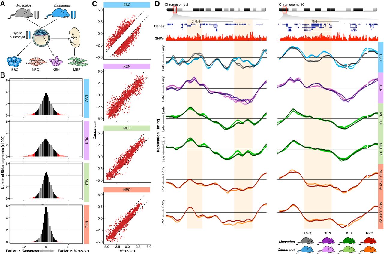 RT asynchrony is lost during differentiation. (A) Distinct cell types were derived from hybrid crosses of M. musculus musculus × M. musculus castaneus. ESC and extraembryonic endoderm stem (XEN) cells were derived from hybrid blastocysts, mouse embryonic fibroblasts (MEF) from hybrid mouse embryos (E12–14), and neural precursor cells (NPC) were differentiated in vitro from hybrid ESC lines. (B) Histograms of RT differences between musculus (129/sv) and castaneus (CAST/Ei) genomes. Labeled in red are the changes higher than the differences between replicates of the same genome. (C) RT asynchronous regions in ESCs become synchronous in differentiated cell types. (D) Two exemplary chromosome regions display the loss of RT asynchrony in differentiated cell types. Two replicates of each sample are shown. Four distinct primary MEFs of opposite gender were obtained from different embryos; RT profiles of female MEFs (MEF XX) and male MEFs (MEF XY) are shown. Data from two independently differentiated NPCs derived from distinct ESC lines (F121-9 and Cas129) are shown.