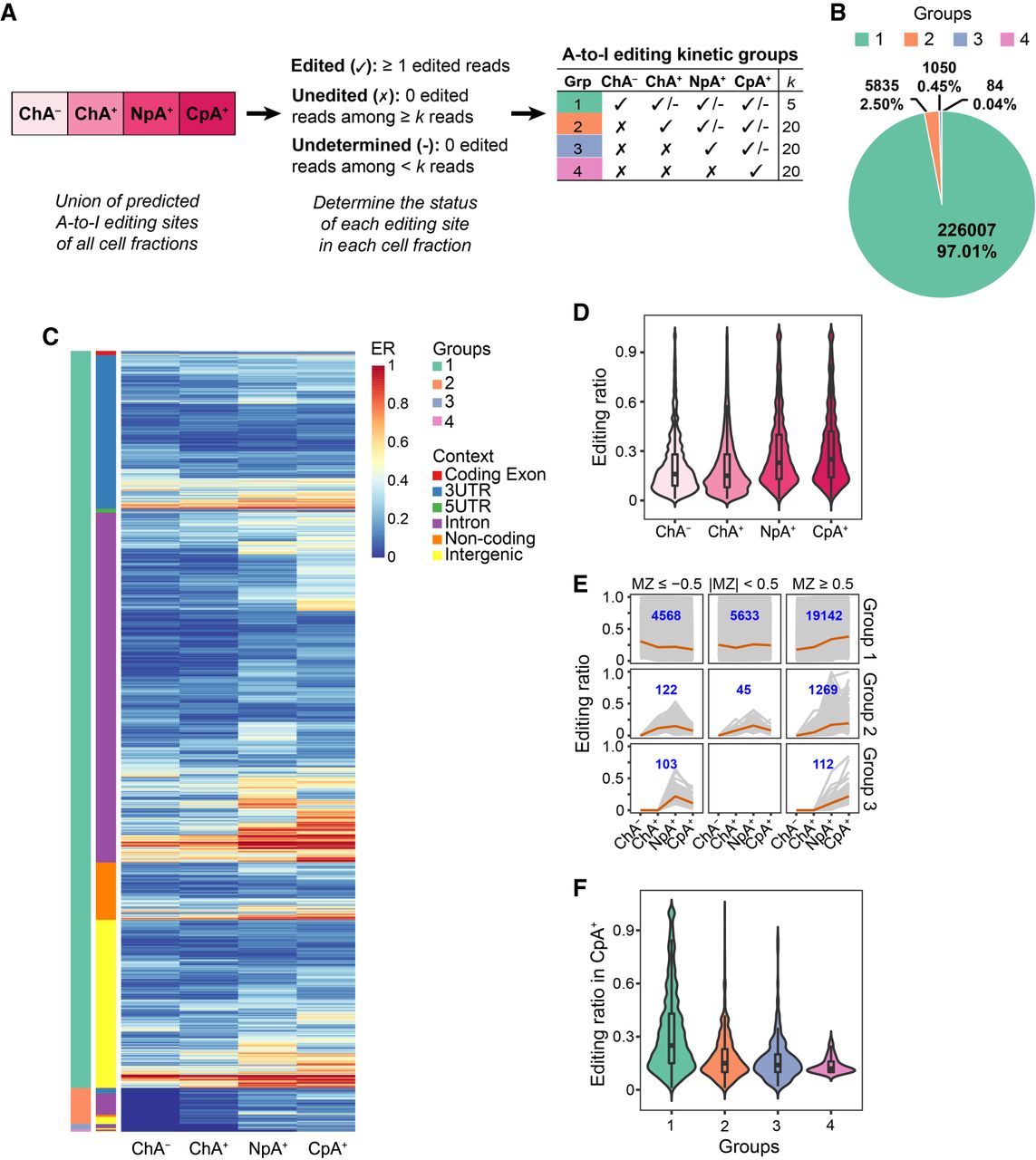 Kinetic groups of RNA editing sites identified via subcellular RNA-seq. (A) Categorization of RNA editing sites into four kinetic groups using cell fractionation RNA-seq. Editing sites in each group are labeled as edited (✓), unedited (✗), or undetermined (-) in each subcellular fraction. The read coverage cutoffs of the editing sites (k) are illustrated in the table (for details, see Methods). (B) Number and percentage of A-to-I RNA editing sites in each editing kinetics group. (C) The editing ratios (ER) of each editing site in the four groups. The genomic location of an editing site is shown in color codes. All editing sites included in this analysis were required to have at least five total reads in each fraction (same for panels D–F). A total of 29,345, 1437, 220, and 84 sites were included for groups 1, 2, 3, and 4, respectively, with group 1 editing sites accounting for 94% of all. (D) Editing ratio distribution of the editing sites in C (union of all four kinetic groups) in each subcellular fraction. Note that for each fraction, editing ratios of the union of all groups are shown. (E) Editing ratios in different subcellular fractions of editing sites in C with different ranges of MZ scores. Each gray line represents one editing site. The average editing ratios are highlighted in orange. The number of editing sites in each panel is shown in blue. It should be noted that MZ scores cannot be calculated for sites with constant editing ratios across two consecutive fractions; thus, they were excluded from this analysis. (F) Editing ratios of each kinetics group observed in mature mRNAs (CpA+).