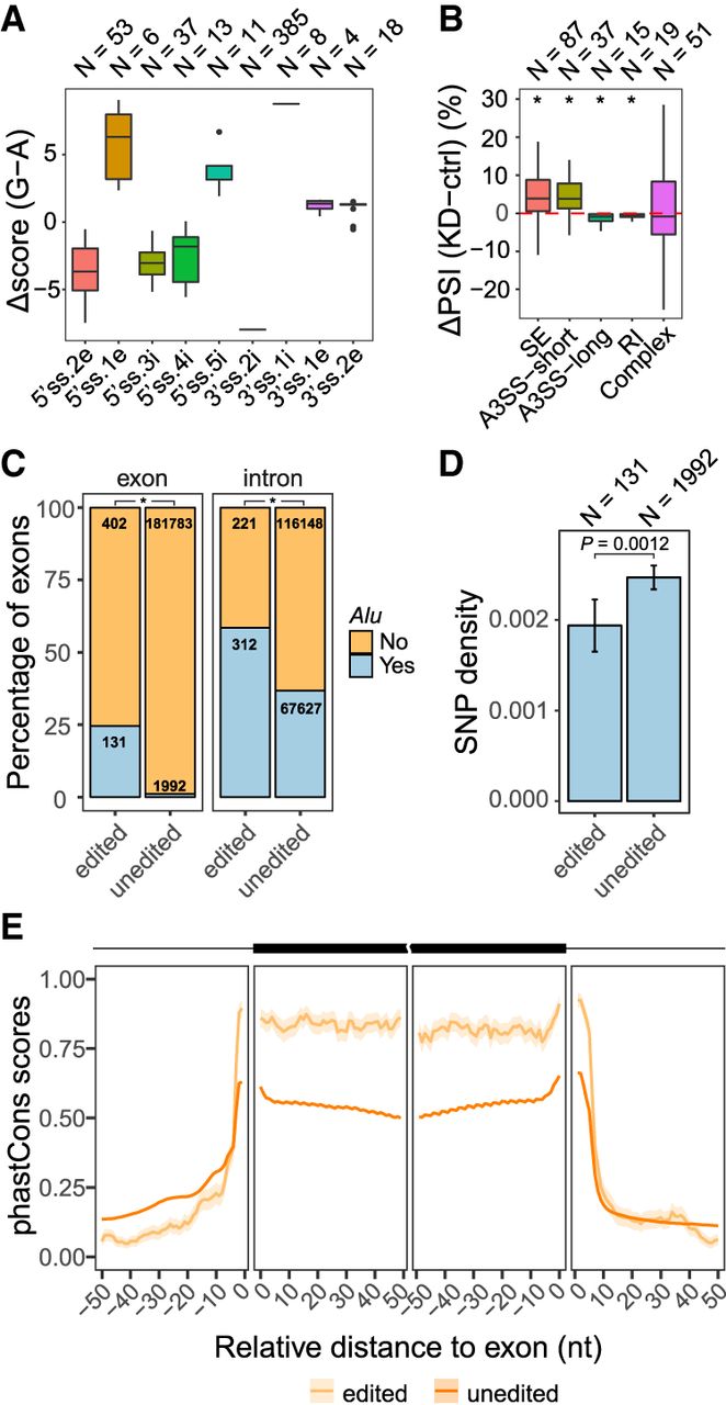 RNA editing sites located in splice site regions. (A) Box plot of the difference in splice site strength caused by A-to-I editing. Splice site scores were calculated using the maxEnt method (Yeo and Burge 2004): (5′ss) 5′ splice site; (3′ss) 3′ splice site; (i) intron; (e) exon; (N) number of editing sites. The number before i or e represents the distance (in nucleotides) from the exon–intron boundaries. Nucleotide positions without any editing sites in our data were excluded from this plot. (B) Box plot of PSI changes (ΔPSI) upon ADAR1 KD in U87MG cells measured via RNA-seq for exons with editing sites at the −2 intronic position of 3′ss (3′ss.2i), altering the canonical 3′ acceptor site from AG to GG: (SE) skipped exons; (A3SS-short) alternative 3′ss generating shorter exons given the edited G in the 3′ss; (A3SS-long) alternative 3′ss generating longer exons given the edited G in the 3′ss; (RI) retained introns; (Complex) complex splicing patterns; (N) number of exons; (*) P < 0.05 for ΔPSI ≠ 0 (Wilcoxon rank-sum test). (C) Percentage of exons or their upstream introns that overlap Alu repeats: (edited) exons or introns with editing sites in the 3′ss AG sequence; (unedited) all internal exons or introns without editing sites in the 3′ss. The number of exons or introns in each category is shown. The edited groups are significantly more enriched with Alus than unedited groups for both panels. (*) P < 2.2 × 10−16 (Fisher's exact test). (D) Density of SNPs (common SNPs in dbSNP version 150) in Alu-overlapping exons as described in C. Error bars represent standard errors. Edited exons have smaller SNP density than unedited ones (P = 0.0012, Wilcoxon rank-sum test). (E) Average phastCons scores of non-Alu-overlapping skipped exons (described in C) and their flanking intronic regions. Exon–intron boundaries are positioned at 0. The shaded area represents standard errors.