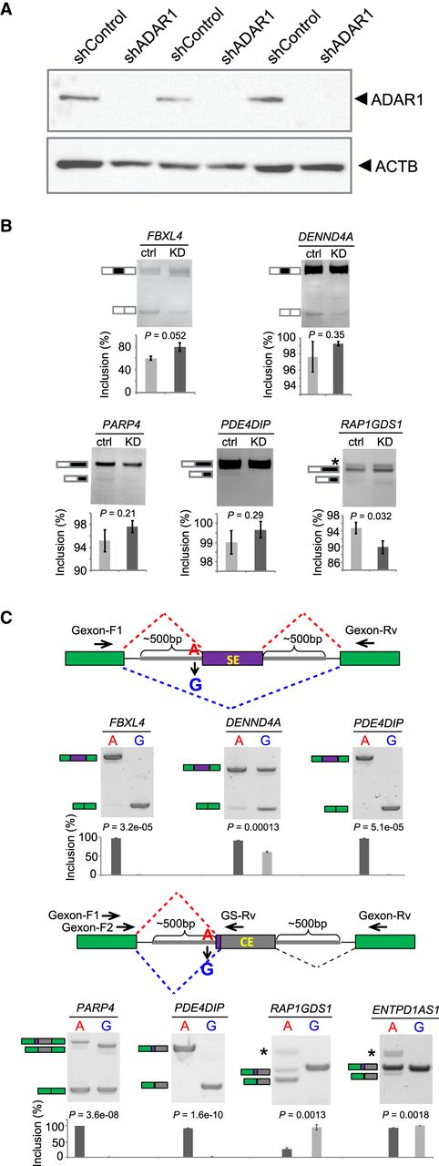 Experimental validation of splicing changes induced by 3′ss editing. (A) Western blot of ADAR1 in U87MG cells stably expressing control shRNA (shControl) or ADAR1 shRNA (shADAR1). Three biological replicates are shown. (B) RT-PCR results of endogenous splicing levels of five randomly chosen exons with 3′ss editing. U87MG cells in A were used. (Ctrl) shControl; (KD) shADAR1. Exon inclusion levels (%) were calculated based on triplicated experiments. One example gel image is shown. Error bars represent standard deviation. P-values were calculated by Student's t-test. (C) Seven randomly chosen editing-dependent alternative splicing events were validated in minigene systems. The minigene designs to validate exon skipping (top) and alternative splice site events (bottom) are shown, respectively. Primers used to amplify the splicing products are shown as arrowheads. In the bottom diagram, Gexon-F1 and Gexon-Rv represent the forward and reverse primers used for PARP4. Gexon-F2 and GS-Rv refer to the forward and gene-specific reverse primers for the other three exons. Exon inclusion levels (%) were calculated based on triplicated experiments. One example gel image is shown. Error bars represent standard deviation. P-values were calculated by Student's t-test.