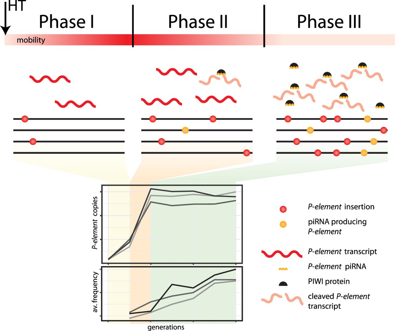 Shotgun silencing model of the P-element invasion. The heatmap indicates mobility of the P-element. (av. frequency) average population frequency of the P-element insertions.