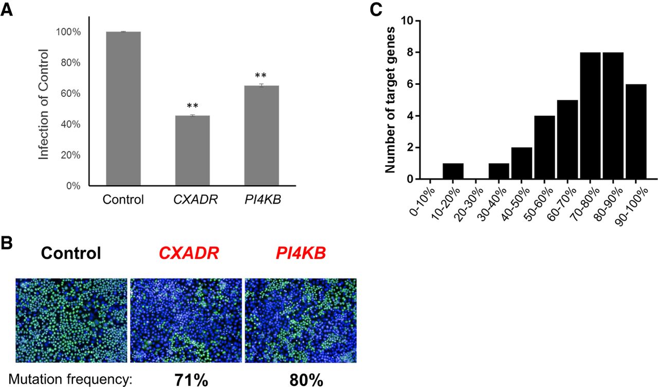Plasmid-based sgRNA constructs as a tool for a genetic perturbation screen in human cells. (A,B) HeLa cells were transfected with sgRNA-expressing plasmids (Control, CXADR, and PI4KB) and infected with CVB3 at an MOI of 5. At 8 h post-infection, cells were fixed and stained with anti-3C antibody (green) and DAPI (blue). (A) Quantification of infection. Mean ± SEM for quadruplicate experiments. (**) P < 0.01. (B) Representative images of infection are shown. (C) Mutation frequencies determined after transient transfection of 35 sgRNAs and Cas9 plasmid.