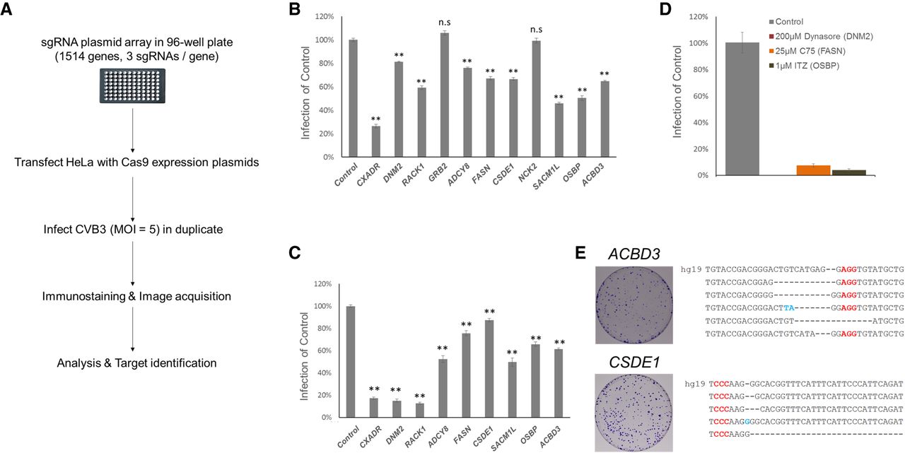 Candidate identification. (A) Schematic presentation of the arrayed CRISPR screen. (B) Quantification of CVB3 infection in HeLa cells transfected with sgRNA-expressing plasmids targeting 10 genes from primary screens. Mean ± SEM for quadruplicate experiments. (**) P < 0.01, (n.s.) nonsignificant. (C) Similar quantification of virus infection in B using newly designed sgRNA. (D) The percentage of CVB3-infected cells (normalized to DMSO control) treated with three known inhibitors of the candidates. Mean ± SD for triplicate experiments. (E) HeLa cells were transfected with ACBD3 and CSDE1 targeting sgRNAs and infected with CVB3. Surviving cells were stained and are shown. Surviving colonies were expanded and the target region was sequenced to confirm the mutations. Red characters indicate the PAM and blue characters indicate insertions. hg19 is the wild-type sequence of each gene. As our target sites have the same sequence in both references (i.e., hg19 and GRCh38), using GRCh38 would not significantly affect our conclusions.