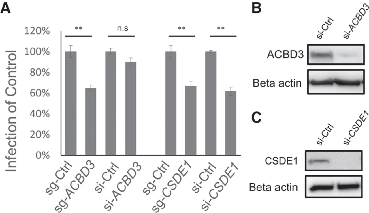 HeLa cells were transiently transfected with siRNAs and sgRNAs targeting ACBD3 or CSDE1. (A) Cells were infected with CVB3, fixed, and stained. The percentage of CVB3-infected cells (normalized to sgRNA or siRNA control). Mean ± SEM for triplicate experiments. (**) P < 0.001, (n.s.) nonsignificant. (B,C) Cells were transfected with control siRNA, ACBD3 siRNA, and CSDE1 siRNA. The expression level of each protein was measured by western blot using the anti-ACBD3 antibody (B) and anti-CSDE1 antibody (C).
