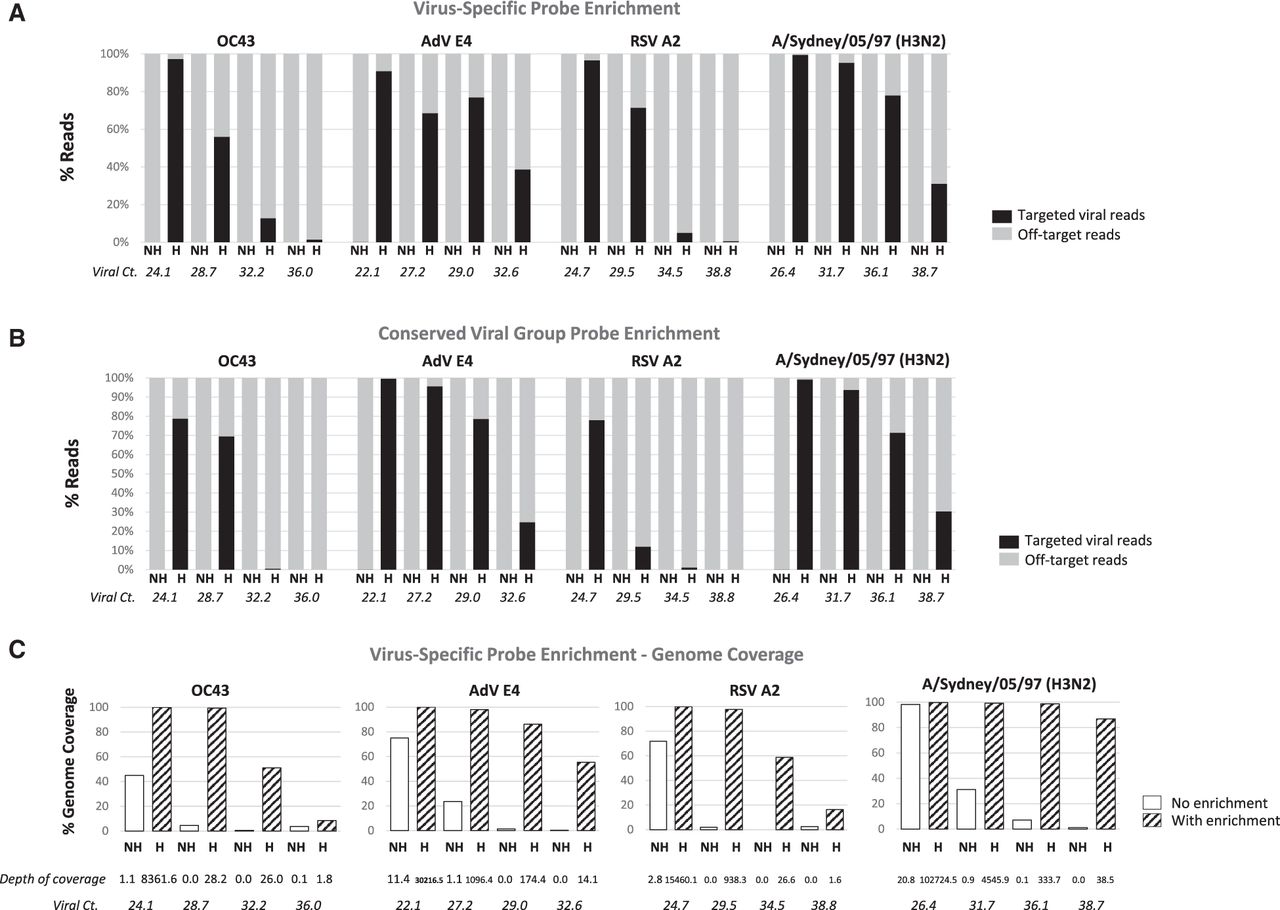 Sensitivity of enrichment in hybridization. Samples were prepared as 10-fold serial dilutions of reference viral nucleic acids spiked into a constant amount of human RNA prior to library preparation. The frequency of reads identified by Kraken is shown in bar graphs for each sample with and without enrichment (H: hybridized; NH: nonhybridized) for (A) virus-specific probe enrichment and (B) conserved viral group probe enrichment. From the same sequencing run, the linear genome coverage is shown (C) for samples with enrichment (diagonal stripes) or without enrichment (white) with virus-specific probes. Viral Ct and (average) depth of coverage are shown below the bar graphs. Abbreviations of virus names are listed in Supplemental Table S1.