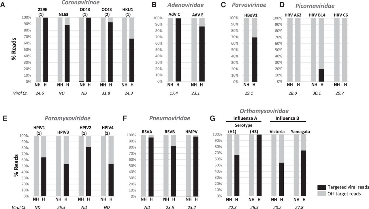 Distribution of sequence reads for clinical samples enriched with virus-specific probes. The frequency of reads identified by Kraken for each sample with and without enrichment (H:hybridized; NH: nonhybridized) is shown in bar graphs for each viral family/subfamily tested: (A) Coronavirinae; (B) Adenoviridae; (C) Parvovirinae; (D) Picornaviridae; (E) Paramyxoviridae; (F) Pneumoviridae; (G) Orthomyxoviridae. Viral Ct is shown below the bar graphs. (ND) Ct not available. Abbreviations of virus names are listed in Supplemental Table S1.