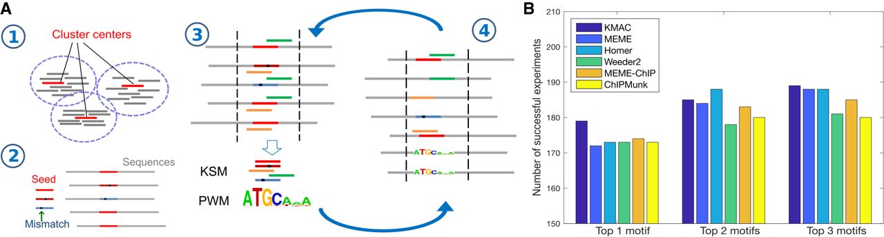 KMAC motif discovery outperforms other methods when detecting motifs in ChIP-seq data. (A) KMAC motif discovery schematic. Step 1: Overrepresented k-mers with length k are clustered using density-based clustering. Bars represent the k-mers, whereas red bars represent the cluster center exemplars. Step 2: A cluster center is used as a seed k-mer. The seed k-mer and k-mers with a one-base mismatch are used to match and align the sequences. Step 3: A pair of KSM and PWM motifs are extracted from the aligned sequences. Step 4: The KSM and PWM motifs are used to match and align the sequences. Steps 3 and 4 are repeated until the significance of the motifs stops to improve. (B) The motif discovery performance of KMAC is compared to the motif discovery performance of various motif finders on 209 ENCODE ChIP-seq experiments.