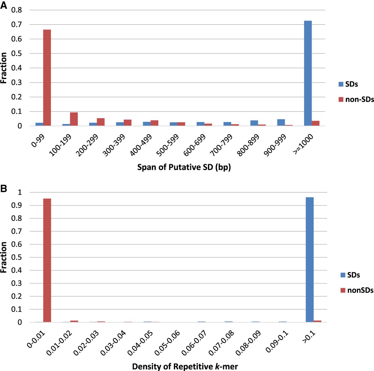 The distribution of the span (A) and density (B) of putative SDs in known SDs (blue) and non-SDs (red) in the hg19 assembly of the human genome.