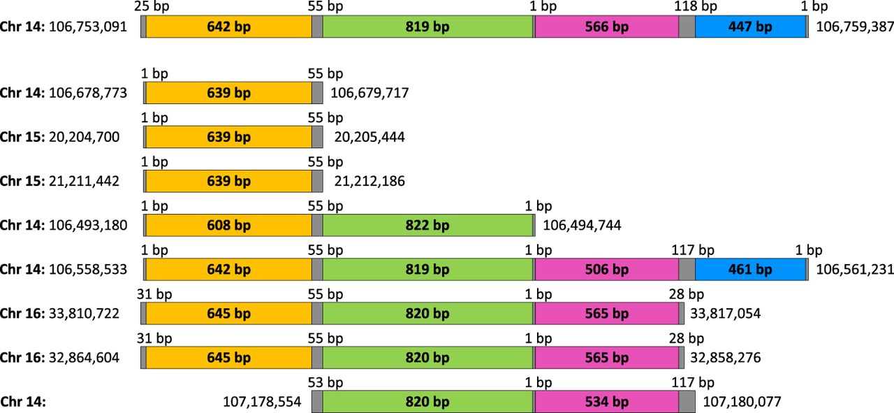 A mosaic SD on Chromosome 14 (spanning positions from 106,753,091 to 106,759,387) formed by eight pairwise alignments and containing four elementary SDs (“hg19” assembly of the human genome). The gray bars represent clusters formed by endpoints of pairwise alignments. Yellow, green, pink, and blue bars represent four elementary SDs in the mosaic SD shown on top. Eight segments below represent intervals aligned to the mosaic SD shown on top.
