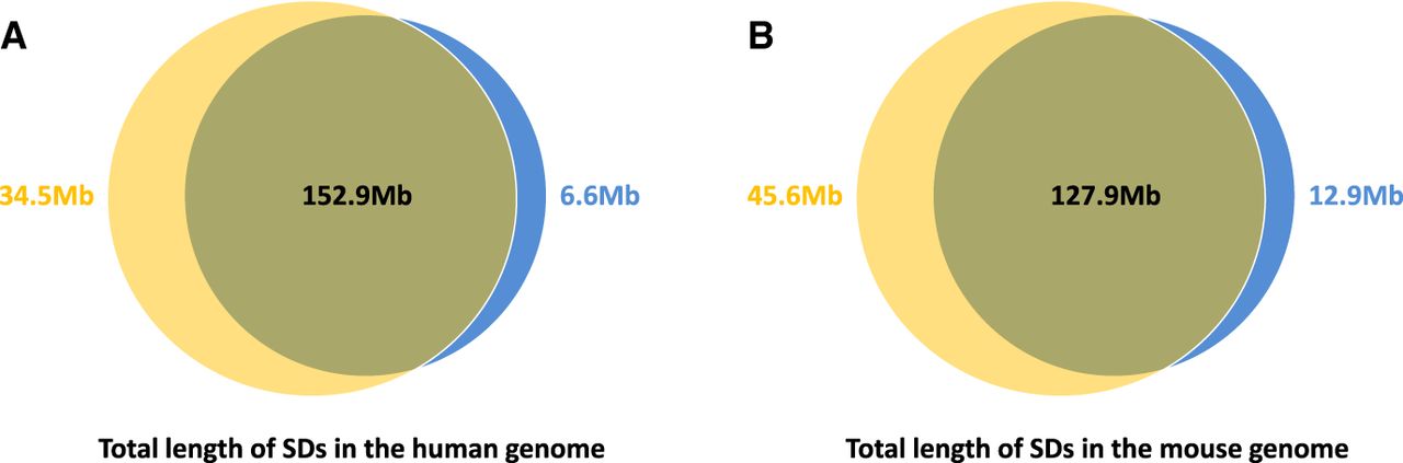 The comparison between known SDs (shown in blue) and SDs identified by SDquest (shown in yellow) in the hg19 assembly of the human genome (A) and the mm8 assembly of the mouse genome (B).
