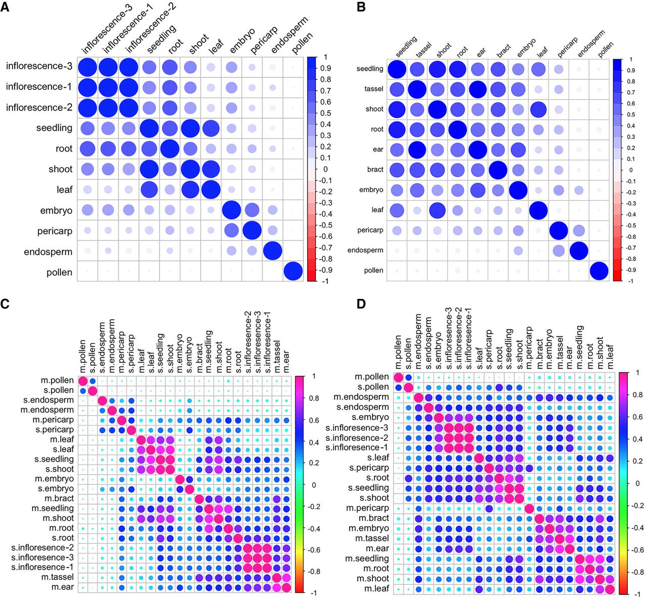 Correlation matrix of genes among tissues, within and between species. Correlation matrices of the following: (A) gene expression among tissues in sorghum, (B) gene expression among tissues in maize, (C) gene expression among tissues between maize and sorghum, and (D) transcription factor expression among tissues between maize and sorghum.