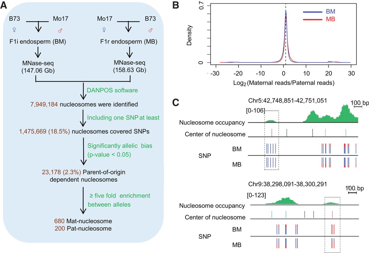 The identification of parent-of-origin-dependent nucleosomes. (A) Pipeline for identifying parent-of-origin-dependent nucleosomes. (B) Allele-specific analysis of nucleosomes in maize endosperm. The x-axis and y-axis represent the log2 of maternal reads divided by paternal reads for the allelically analyzed nucleosomes in endosperm from BM (blue lines) and MB (read lines). (C) Regions around maternal/paternal specifically positioned nucleosomes. Green lines indicate the levels of nucleosomes. The black, light blue, and pink lines indicate the center position of endosperm nucleosomes, allelically analyzed nucleosomes, and high-stringency allele-specific nucleosomes. The percentages of allelic reads of MNase-seq data for specific SNP sites are shown; red lines represent the paternal alleles, and blue lines represent the maternal alleles.