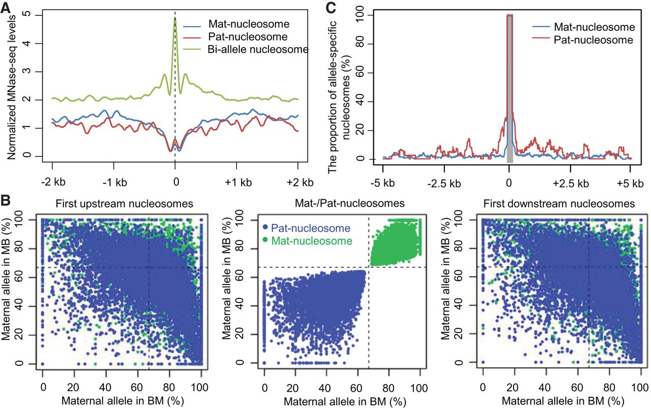 The characteristics of parent-of-origin-dependent nucleosomes. (A) The nucleosome levels around the region of parent-of-origin-dependent nucleosomes in endosperm (BM). Blue lines indicate the nucleosome levels around the region of maternally specific-positioned nucleosomes. Red lines indicate the nucleosome levels around the region of paternally specific-positioned nucleosomes. Green lines indicate the nucleosome levels around the region of 2000 random biallelic nucleosomes. Biallelic nucleosomes are nucleosomes that do not deviate significantly from the 2:1 ratio of maternal allele to paternal allele in each reciprocal hybrid. (B) Allele-specific analysis of parent-of-origin-dependent nucleosomes and their first upstream and downstream nucleosomes. The x-axis and y-axis represent the proportion of maternal reads for the nucleosomes that had at least one SNP and had at least 10 allelic reads in both reciprocal hybrids. The green points represent the allelic status of maternal specifically positioned nucleosomes (mat-nucleosomes) and their first upstream and downstream nucleosomes. The blue points represent paternal specifically positioned nucleosomes (pat-nucleosomes) and their first upstream and downstream nucleosomes. (C) The frequency of allele-specific nucleosomes at each base within ±5 kb of mat-nucleosomes (blue lines) or pat-nucleosomes (red lines) is shown. The gray rectangle represents the region of mat-nucleosomes and pat-nucleosomes.