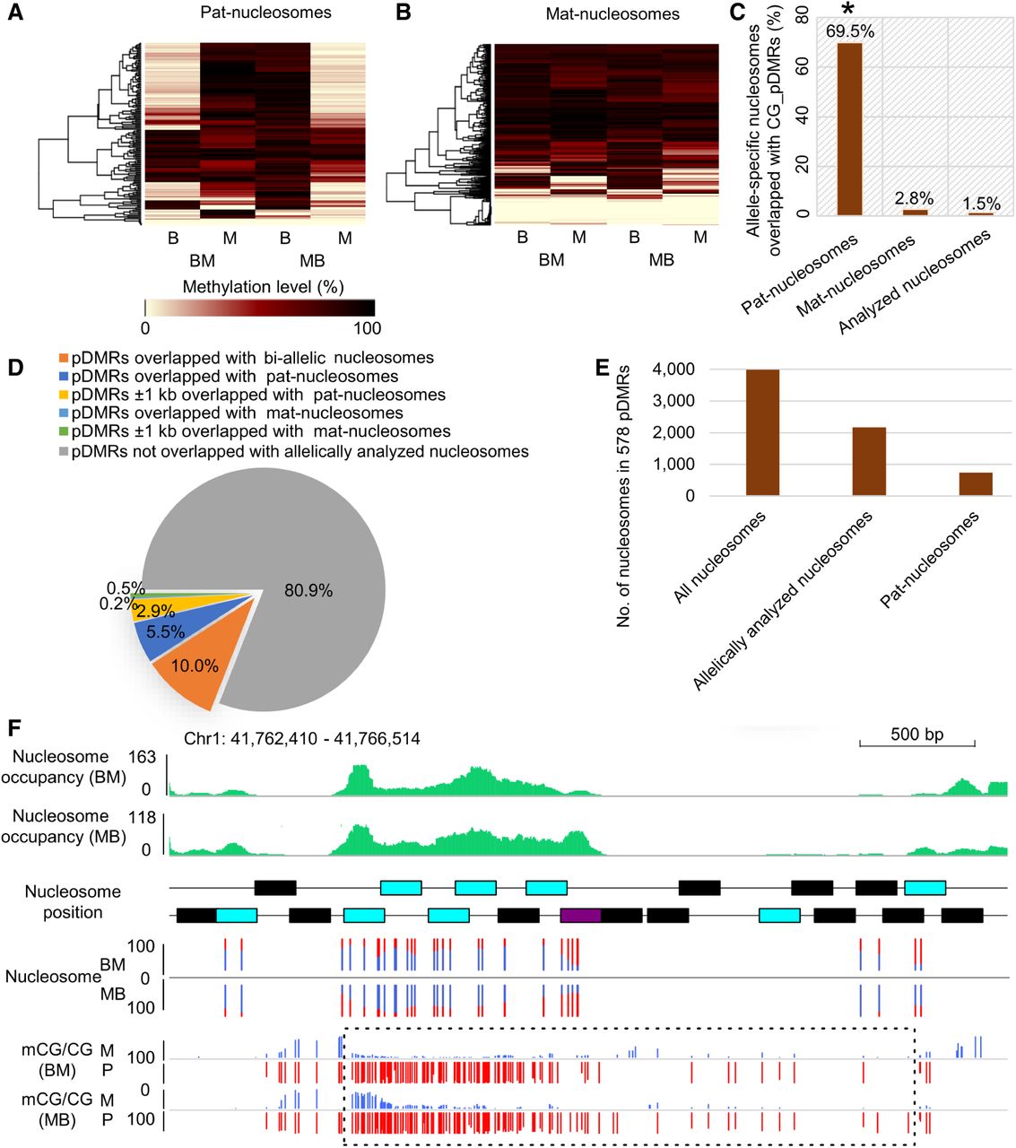 Relationship between DNA methylation and parent-of-origin-dependent nucleosomes. (A,B) Heatmaps of CG methylation levels between alleles of B73 and Mo17 reciprocal crosses at paternal specifically positioned nucleosomes (pat-nucleosomes) and maternal specifically positioned nucleosomes (mat-nucleosomes): (B) B73 allele; (M) Mo17 allele; (BM) B73 × Mo17; (MB) Mo17 × B73. (C) Association of paternal specifically positioned nucleosomes (pat-nucleosomes) and maternal specifically positioned nucleosomes (mat-nucleosomes) with CG_pDMRs. The proportions of pat-nucleosomes, mat-nucleosomes, and all allelically analyzed nucleosomes overlapped with CG_pDMRs are shown on the y-axis. (*) Significant association of pat-nucleosomes with CG_pDMRs (Fisher's exact test; P-value <2.2 × 10−16) compared with that of mat-nucleosomes. (D) The proportion of 6910 CG_pDMRs overlapped with parent-of-origin-dependent nucleosomes. (E) The allelic status of all nucleosomes in 578 CG_pDMRs overlapped with pat-nucleosomes. (F) The integrated view of nucleosome occupancy in one CG_pDMR. The normalized nucleosome levels of endosperm (BM) are plotted in green. The black, blue, and purple rectangles indicate the position of endosperm nucleosomes, allelically analyzed nucleosomes, and high-stringency allele-specific nucleosomes. The percentages of allelic reads of MNase-seq data for specific SNP sites are shown, with red lines for the paternal allele and blue lines for the maternal allele. The DNA methylation level for specific SNP sites are shown for both maternal and paternal alleles, with red lines for the paternal allele (P) and blue lines for the maternal allele (M). The dotted rectangle highlights the pDMRs identified in this region.