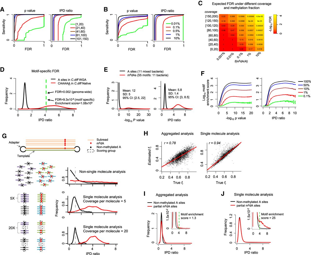 Comprehensive evaluation of m6dA detection based on SMRT-seq data. (A,B) Sensitivity-FDR curves at different levels of per strand SMRT-seq coverage (A) and fraction of methylated A sites in the genome (B). Curves are estimated based on either P-value or IPD ratio; both are shown. FDR estimation is based on the coverage-matched native (Escherichia coli with m6dA at GATC sites; Methods) and WGA samples. (C) FDRs estimated for different combinations of per strand SMRT-seq coverage and fraction of m6dA sites, f(m6dA/A), in the genome. FDR estimation is based on the coverage-matched native and WGA samples (Methods) at an IPD ratio of four. (D) Motif specific methylation detection leads to more reliable m6dA calls with lower FDRs. (E) Distribution of P-values (−log10) and IPD ratios of m6dA events (red) and nonmethylated A's (black) from 11 well-characterized bacterial m6dA methylomes. (F) Enrichment score for motifs with different fractions of motif sites methylated across the genome fm(m6dA/A), estimated based on P-value (−log10; left) and IPD ratio (right). SMRT-seq data from 11 bacterial species/strains with well-characterized m6dA methylomes are used for this simulation analysis. (G) Schematic illustrating single-molecule-level analysis for the estimation of partial methylation. A single molecule (two DNA strands and two adapters) and the subreads that are produced from the top strand of this molecule in SMRT-seq (top). For a given genomic position, when non-single-molecule analysis is performed, IPD ratios for the methylated and nonmethylated subreads follow two exponential distributions (red and black curves in the second panel). In contrast, when single-molecule analysis was performed, IPD ratios across all molecules follow two normal distributions with smaller variance over increasing coverage per molecule strand (third and fourth panels). (H) Estimation of partial methylation fl(m6dA/A) by aggregate analysis (left) and single-molecule-level analysis (right). x-axis indicates background truth fl based on simulation; y-axis, estimated fl; and dots, 4359 A's with known fraction of m6dA methylation based on subsampling from a well-characterized E. coli m6dA methylome. (I,J) Distribution of IPD ratios for partially methylated m6dA sites and nonmethylated A's based on aggregate analysis (I) and single-molecule level analysis (J). The inset provides an enlarged view. The motif enrichment score for the same, known methylation motif GATC significantly differs between the two types of analyses (1.3 in aggregated analysis vs. 25 in single-molecule analysis).