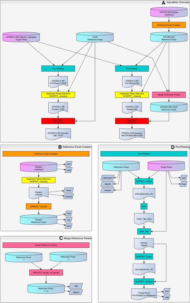 Flowchart of the whole imputation process (see the EPIGEN-Brazil Scientific Workflow: http://www.ldgh.com.br/scientificworkflow/flowcharts.php). (A) Overview of the complete imputation process. (B,C) Two previous tasks may be required for imputation if it is necessary to create or merge reference panels. The Reference Panel Creation task (B, and orange color process in A) converts a data set of unphased genotypes into a reference panel, producing the EPIGEN-5M Reference Panel of haplotypes from the EPIGEN-5M data set. The Merge Reference Panels task (C, and pink color process in A) produces combinations of two different panels using IMPUTE2 software, generating the EPIGEN-5M+1KGP Reference Panel. The imputation process itself consists of three main tasks: pre-phasing, haplotype phase inference, and imputation. The pre-phasing task (D, and green color processes in A) performs strand alignment between target and reference panel using software SHAPEIT2, PLINK, and the scripting language AWK. Haplotype phase inference task (yellow color processes in A) of the target data set uses the methodology implemented in the software SHAPEIT2, generating .haps and .sample files (target data set aligned and phased with the Reference Panel). The latter files serve as input for the imputation task (red color processes in A) conducted with software IMPUTE2, following the “best practices” guidelines in the software documentation.