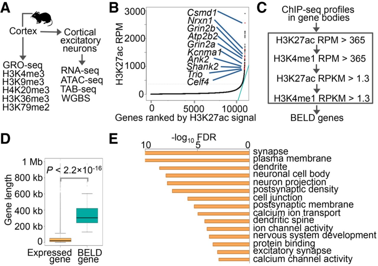 BELD genes in the mouse cortex. (A) Diagram of genomic profiling in this study. The RNA-seq, ATAC-seq, TAB-seq, and WGBS were performed from cortical excitatory neurons, while the GRO-seq and ChIP-seq were performed from the cortex. The cortical excitatory neurons and the cortex were obtained from 6-wk-old male mice. (B) Distribution of gene body H3K27ac signal (RPM) across expressed genes in the cortex. The green line indicates the tangent line with a slope of one. Ten examples of BELD genes with a known role in ASD risk are highlighted. (C) A workflow diagram demonstrating the process used to identify BELD genes. (D) Boxplots of gene lengths of expressed genes and BELD genes in the cortex. P indicates P-value, one-tailed t-test. (E) The top 15 enriched Gene Ontology terms of the BELD genes.