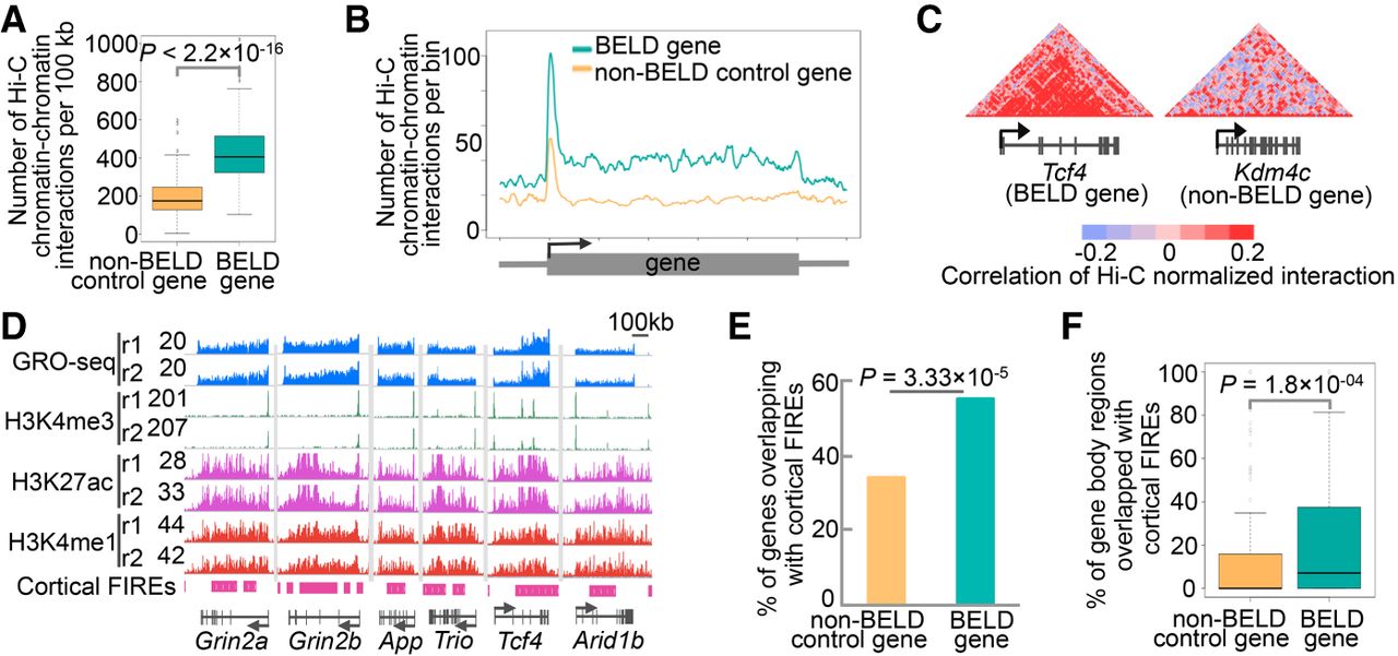 Chromatin–chromatin interactions in BELD genes. (A) Boxplots of Hi-C chromatin–chromatin interactions per 100 kb in non-BELD control genes and BELD genes. P indicates P-value, one-tailed t-test. (B) Comparisons of Hi-C chromatin–chromatin interactions per bin in the cortex between non-BELD control genes and BELD genes in gene body regions and surrounding regions (±100 kb). The values of y-axes are normalized to gene length. (C) Heatmaps of correlations of Hi-C normalized interactions in gene body regions and surrounding regions (±100 kb) of Tcf4 and Kdm4c. (D) Browser representations of GRO-seq, ChIP-seq, and cortical FIREs profiles at six BELD genes linked to ASD. (E) Percentage of genes overlapping with cortical frequently interacting regions (FIREs). P indicates P-value, Fisher's exact test. (F) Boxplot of percentages of gene body regions that overlap with cortical FIREs. P indicates P-value, one-tailed t-test.
