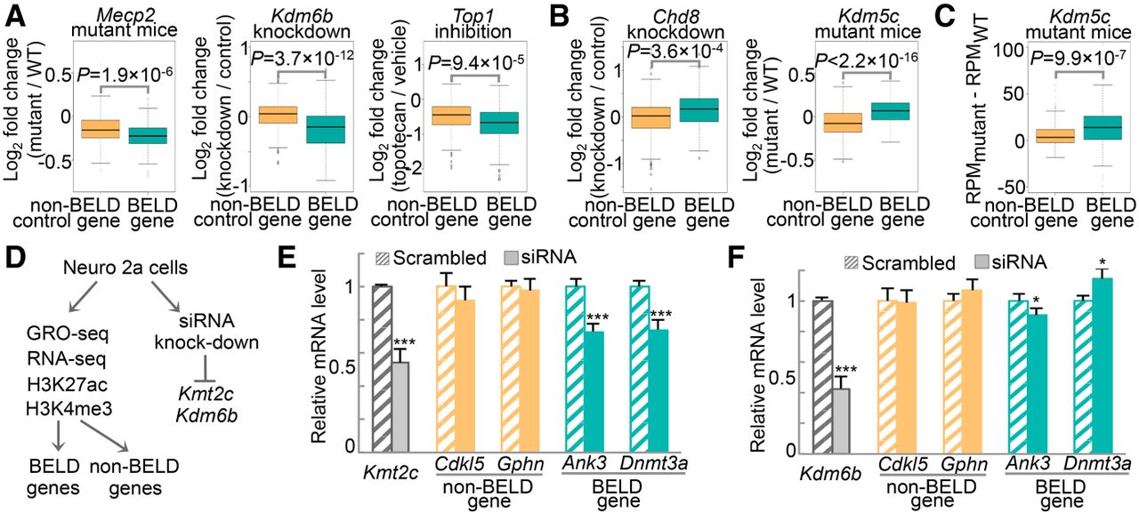 Expression of BELD genes show vulnerability to disruption of ASD-associated chromatin regulators. (A) Boxplots of expression changes of non-BELD control genes and BELD genes in response to MECP2 R106W mutation (mouse cortex), Kdm6b knockdown (cortical neurons), or TOP1 inhibition by topotecan (cortical neurons). P indicates P-value, one-tailed t-test. (B) Boxplots of expression changes of non-BELD control genes and BELD genes in response to Chd8 knockdown in cortical neurons or Kdm5c knockout in cortical tissues. P indicates P-value, one-tailed t-test. (C) Boxplots of H3K4me1 changes in gene body regions of non-BELD control genes and BELD genes in the cortex of Kdm5c knockout mice. P indicates P-value, one-tailed t-test. (D) Diagram of genomic profiling and siRNA knockdown in Neuro 2a cells. (E,F) The expression changes of two BELD genes and two non-BELD genes in response to Kmt2c knockdown (E) or to Kdm6b knockdown (F) in Neuro 2a cells. (***) P < 3.76 × 10−7, one-tailed t-test; (*) P < 8.81 × 10−3, one-tailed t-test.